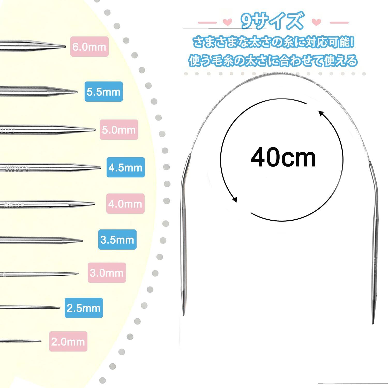 棒針編み針輪針40cm9本セット 9サイズ 棒針 ミニ輪針 ステンレス製 編み棒 手あみ針 手編み道具 手芸道具 編み物用