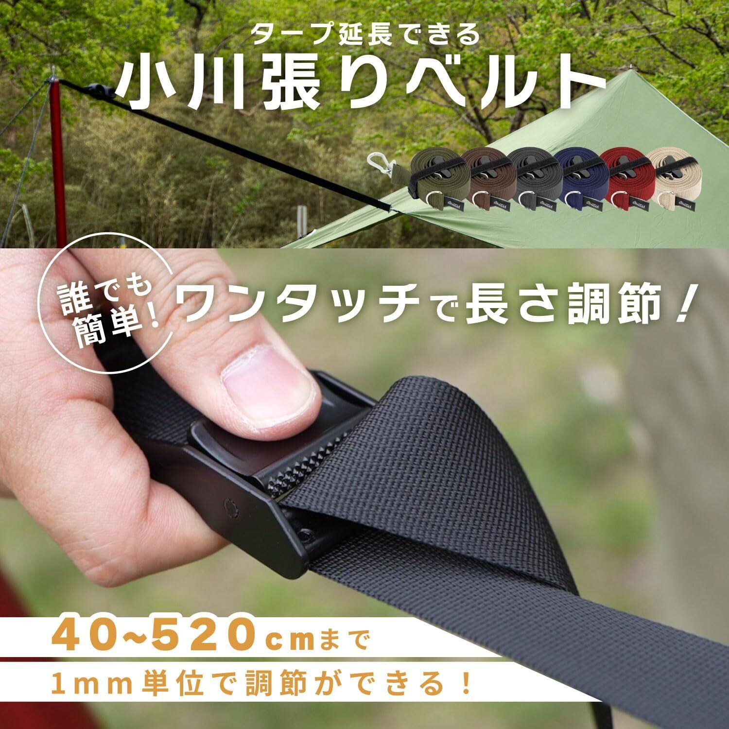 小川張り タープ延長ベルト セッティングテープ ワンタッチ長さ調整5.2m 耐荷重200kg 張り方説明書 収納袋 まとめるバンド付き
