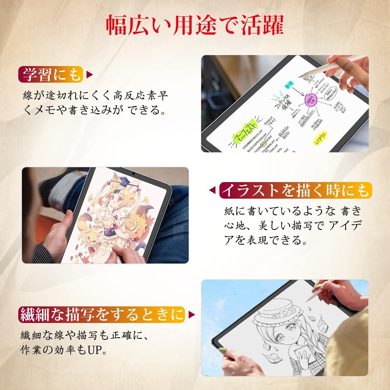 【ケント紙のような描き心地】iPad mini6 ペーパーフィルムは日本からの高密度素材を採用し、適度な摩擦と抵抗力があり、文字やイラストなどを書き込む際に滑りにくく、紙のような質感を楽しめます。また、ペーパーフィルムはApple pencilと交換性があり、ストロークが滑らかでペン先磨耗も抑えられ、快適な書き心地を実現します。