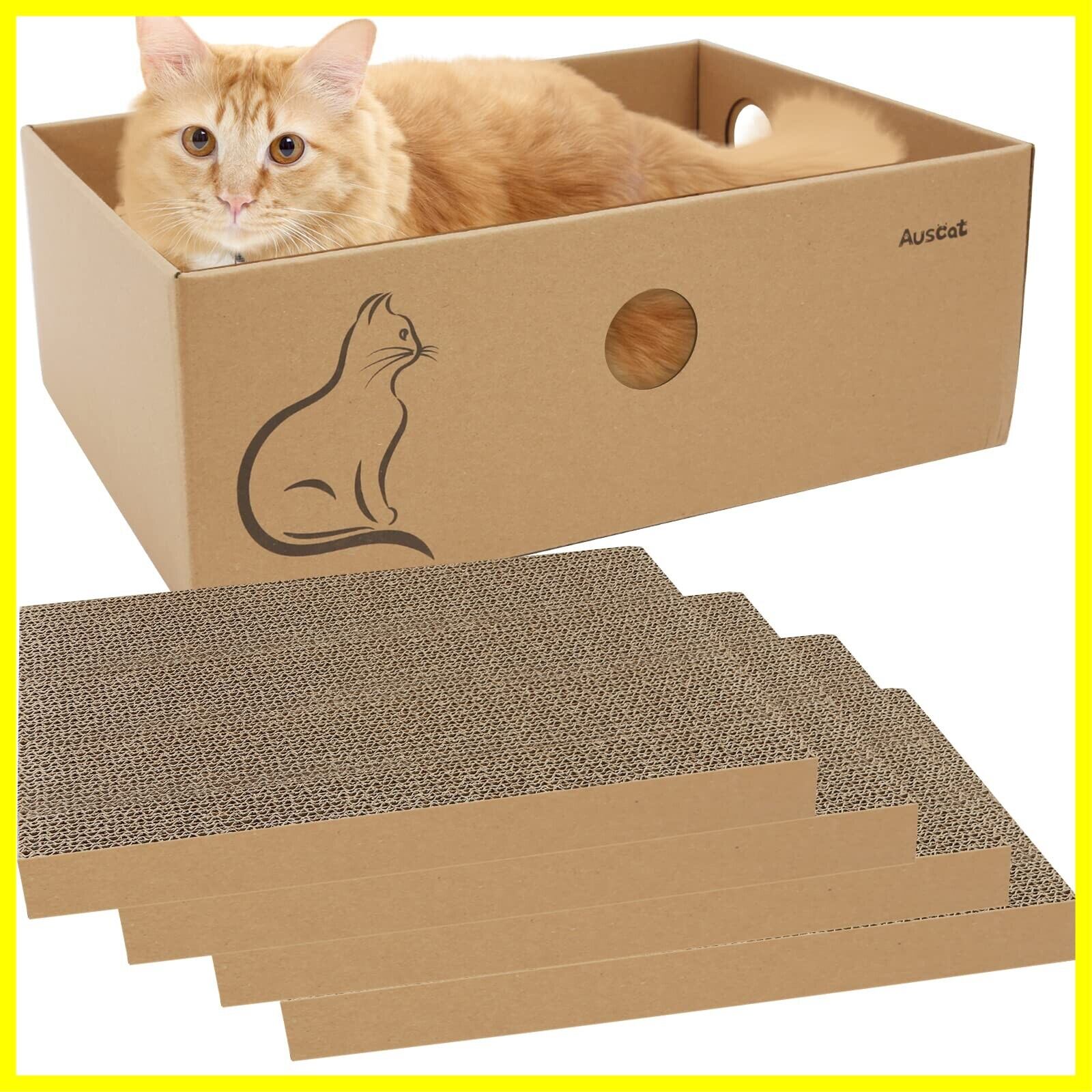 AUSCAT 猫爪とぎ 猫用段ボールつめとぎ 取り換え用爪研ぎ4枚入り 猫ベッド兼用 箱型 37×27×13CM