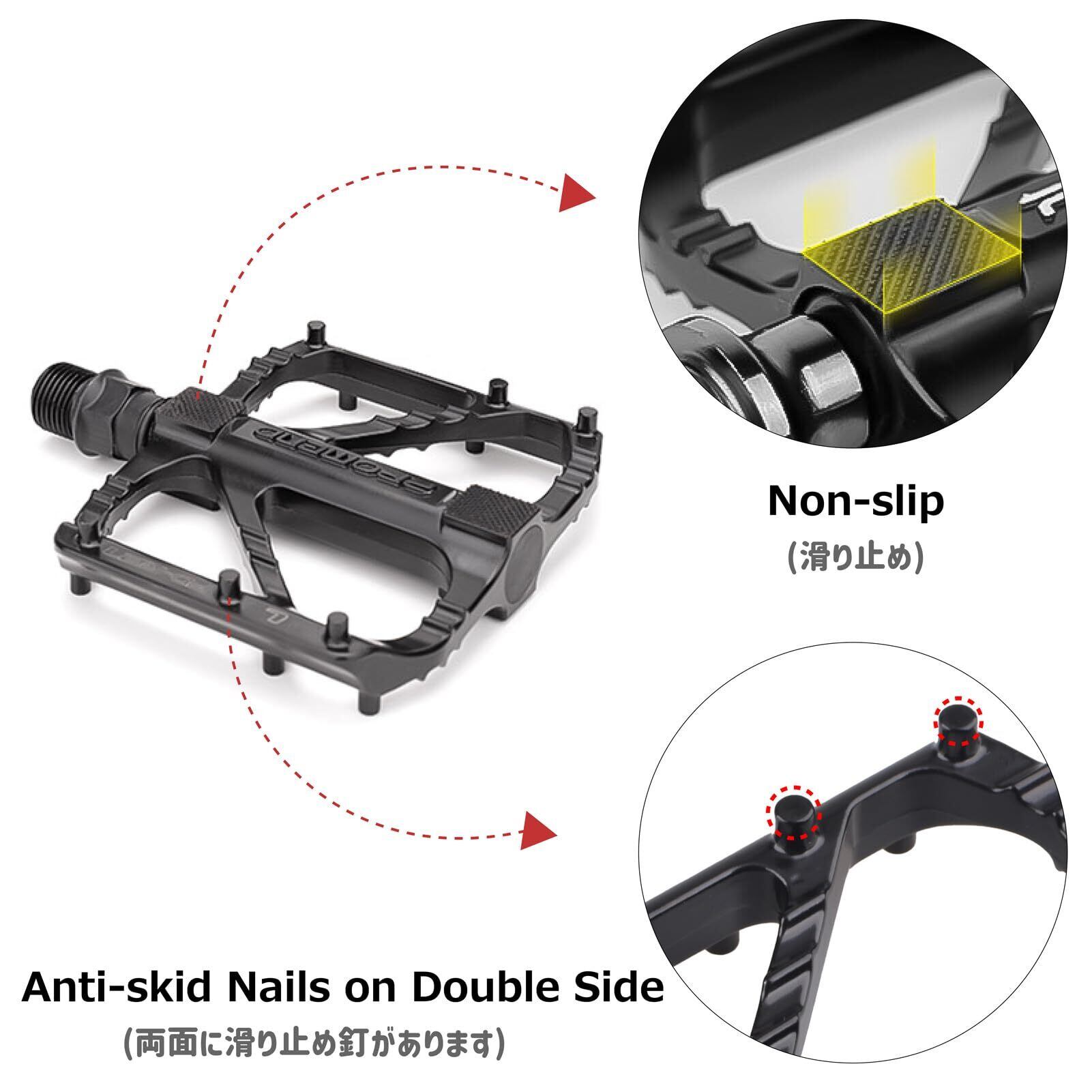 【滑り止め】- 6枚滑り止め釘、ペダルの表面に突起があり、靴のソールをキャッチして足がずれにくくなります