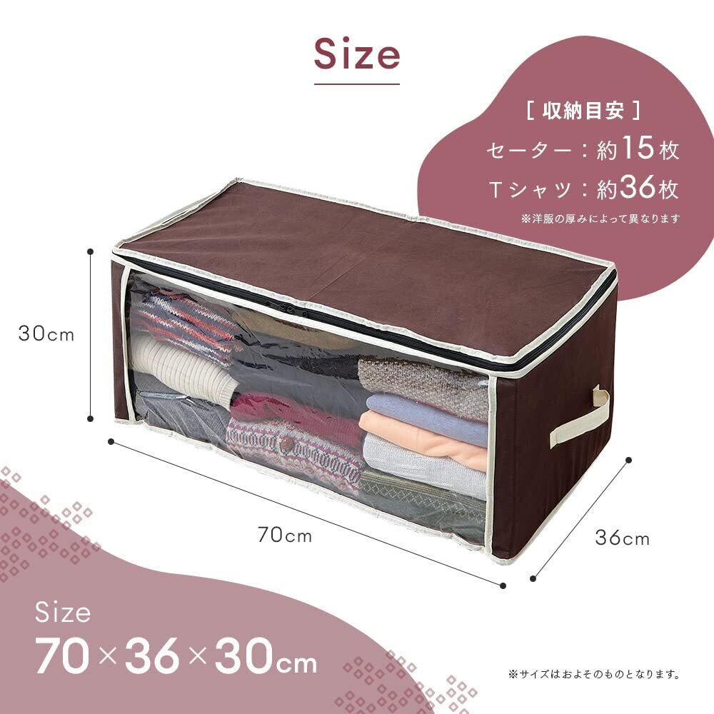 【商品仕様】商品サイズ/(約)70×36×30cm、適応サイズ/薄手衣類:約36枚・セーター:約15枚(衣類の厚みにより異なる)、材質・成分/本体:ポリプロピレン不織布、窓:EVA樹脂