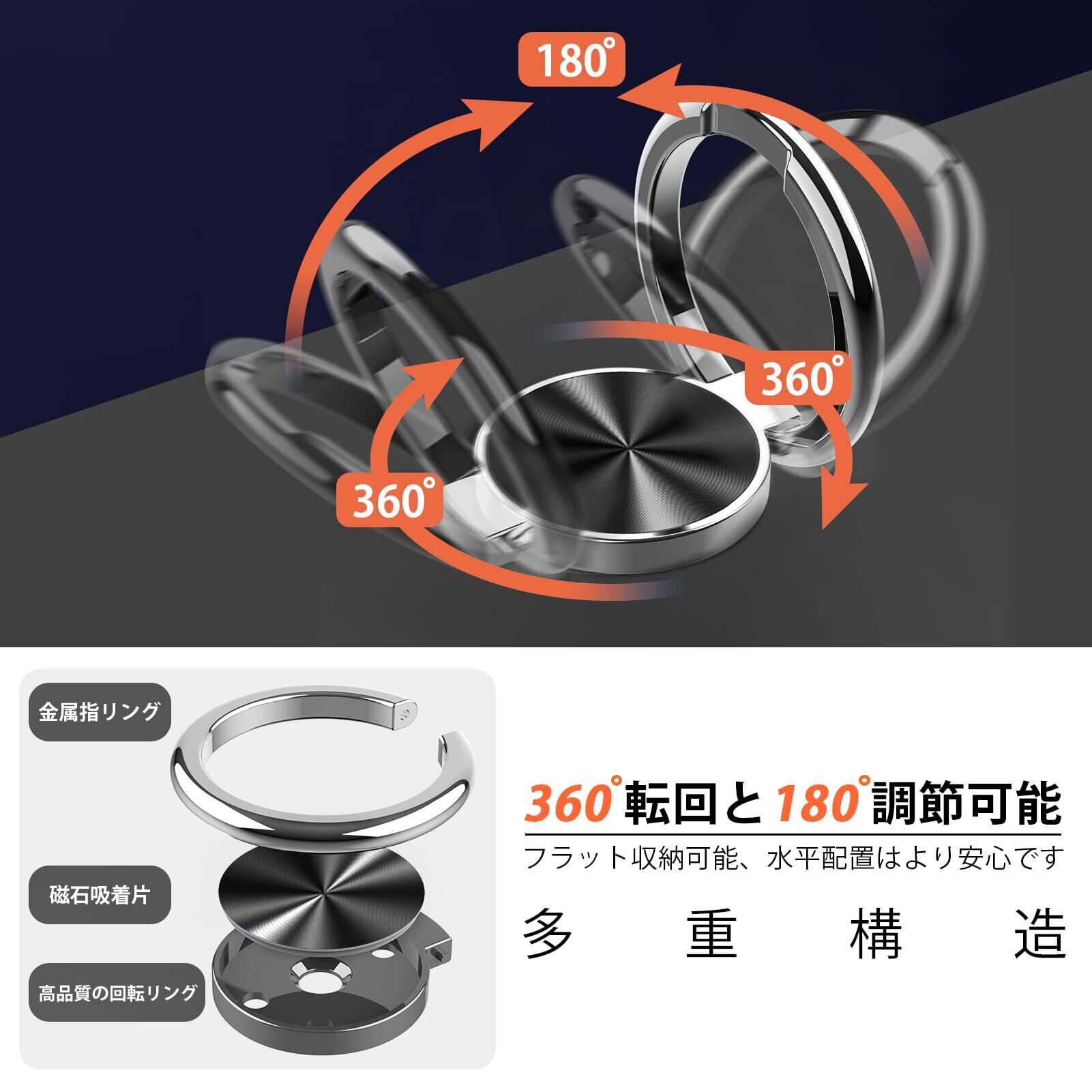【リング付き・スタンド機能】後ろで嵌め込み式リング付き、伝統的なリングと比較して、アイフォーンの水平安定性を維持することができます。ケースを横向きにするとスタンド機能になり、360度回転と120度調節可能です。マグネット対応金属板採用し、車載ホルダーに強く吸着することもできます。