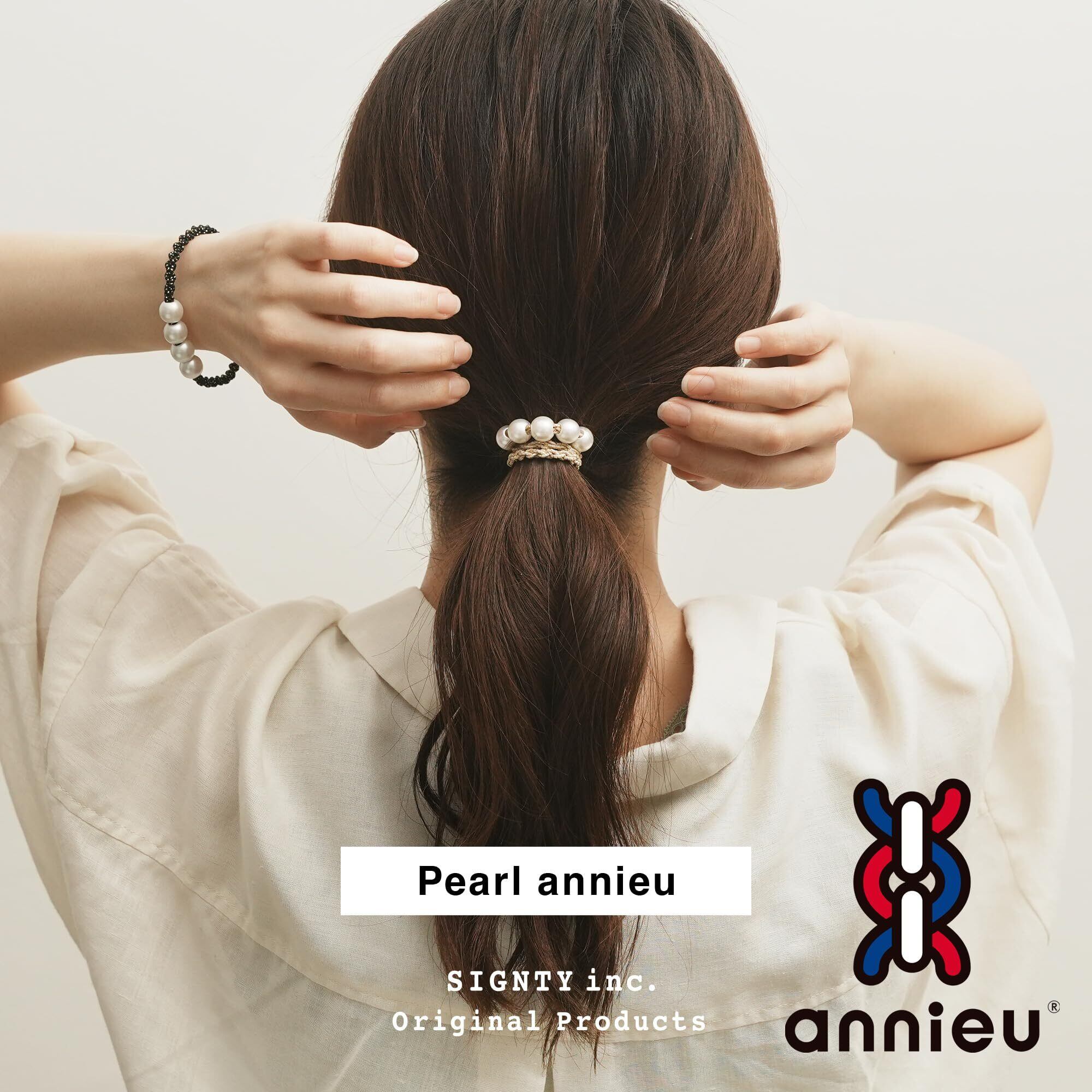 Pearl annieu【パール・アンニュ】 5連パールの圧倒的な存在感がラグジュアリー感をアップ、ブレスレットとしてもGOOD! 樹脂パールは、1つだけ固定されています。他4つのパールは、可動式で自由にお好きな位置へ動かせます。 「今日も、結ぼう。」 髪の毛を、きゅっと結んでも からまりにくくて、するっとはずせる。 だから、髪へのダメージも少ない。 『美容師が考えました』 編み込んだゴムのデコボコが、髪をやさしく結びます。 annieu【アンニュ】は、ゴムを編み込むことで特有の凹凸をつくり、髪の毛を適度に押さえこみます。また、それぞれの接点で支えているので、するっとしたはずし心地を生み出しています。 そして、数本のゴムをあわせていることでカラフルなデザイン性を持つことが出来ました。アンニュは、デイリーユースの「ヘアゴム」であり、そのカラフルなラインナップは、ファッション性も兼ね備えた「ヘアアクセサリー」にもなります。