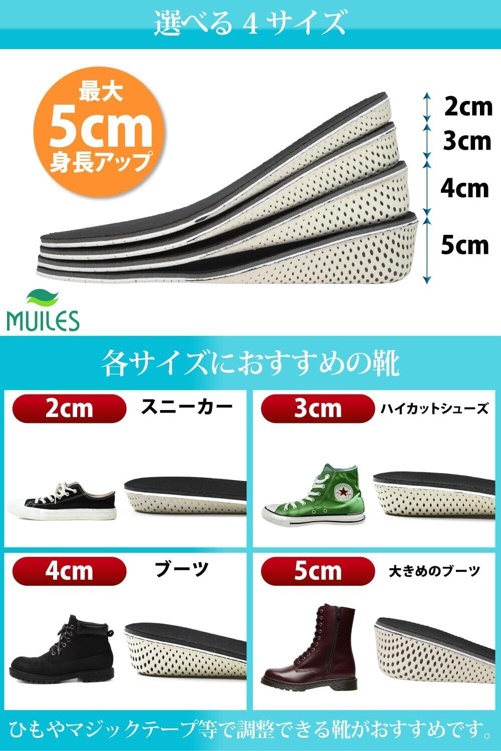 お手持ちの靴の中敷きとして使うだけで身長が最大5cmアップします。身長を高く見せたい方、足を長く見せたい方におすすめです。5cmは大きめのブーツ、4cmはブーツ、3cmはハイカットスニーカー、2cmはスニーカー、革靴などをご使用ください。