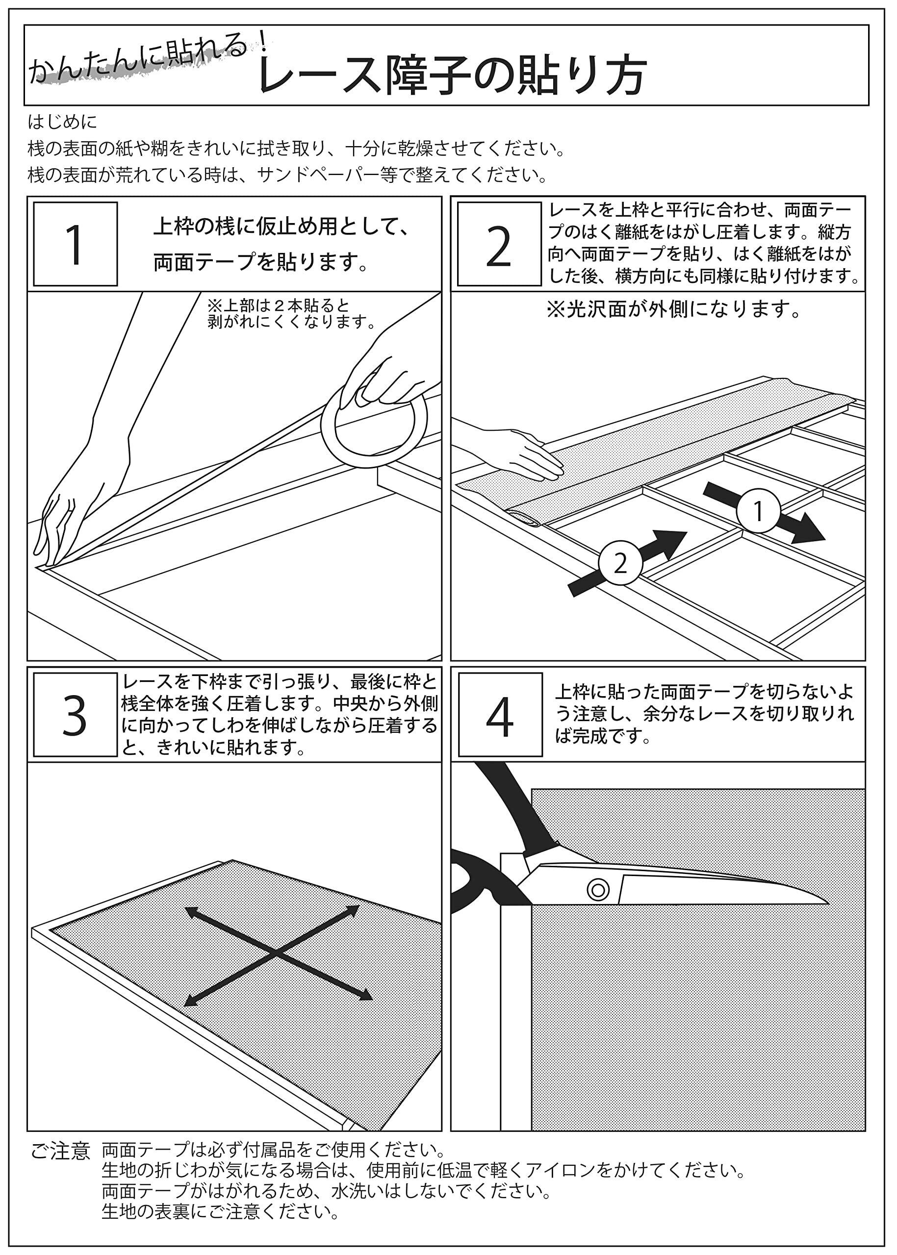 ・夏の暑い時期は太陽の光を遮り冷房効果を高めます。UVカットは約85%。冬は暖気を外に逃がさないので保温性がアップして暖房効果を高めます。一年中節電効果になります。・レース裏側の光沢のあるブライト糸によって、外から見られにくく、昼夜プライバシーを守ります。・レースは紙と違って破れにくいです。取り扱い説明書付き。両面テープ幅5mm×20m 2個入り