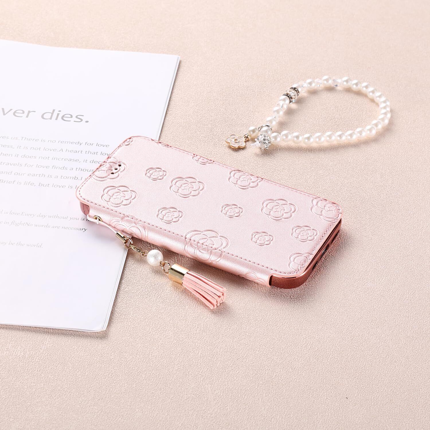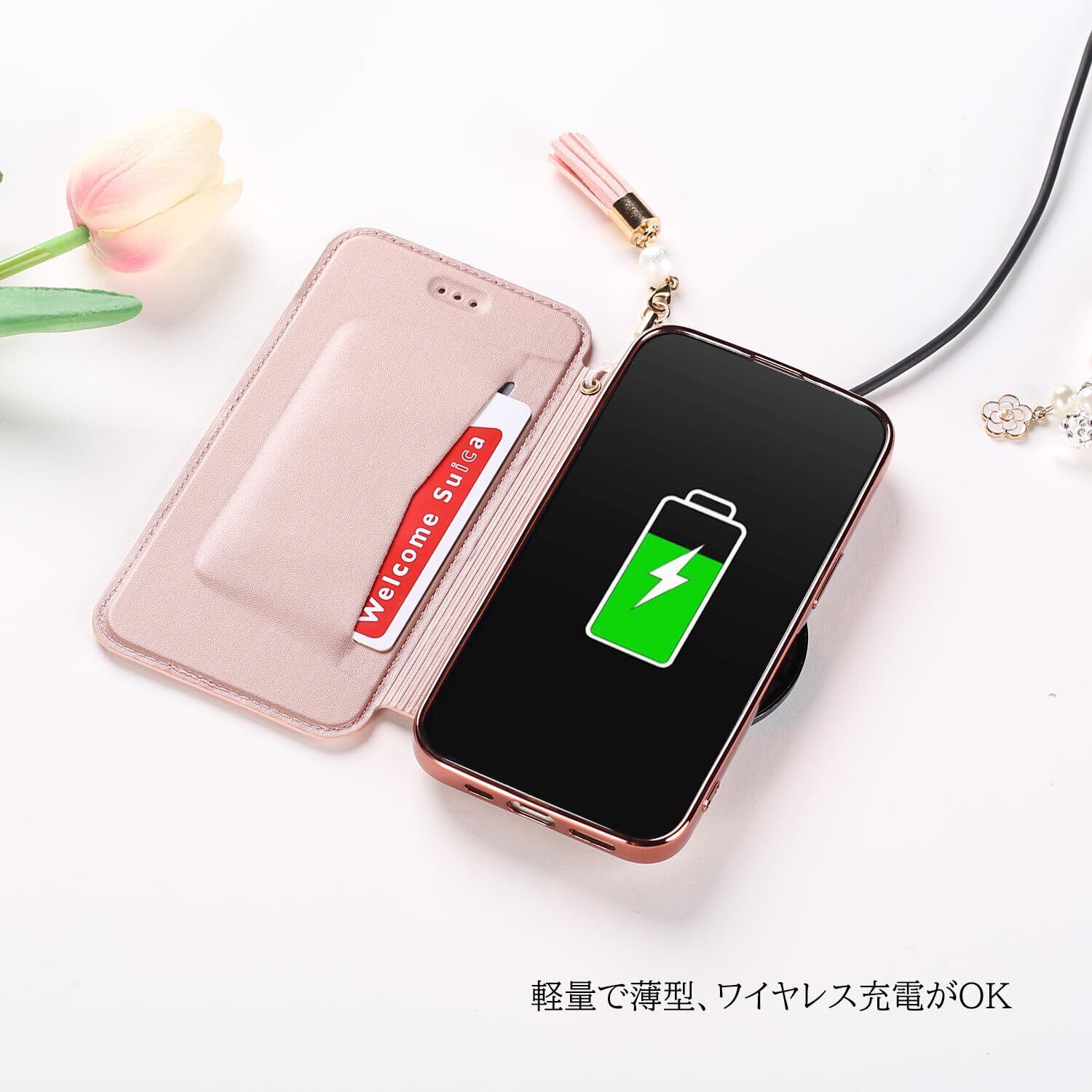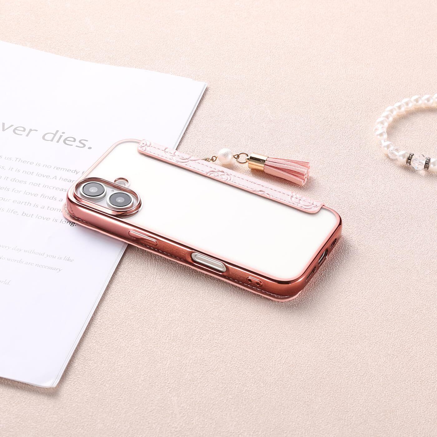 NicNik用の アイフォン16プラス ケース 手帳型 可愛い 花柄 背面クリア 6.7インチ 2024モデル 真珠タッセル付き マグネットなし 鏡付き 押し型 メッキ加工 NicNik向けの iphone16plus ケース 手帳型 ミラー付き カード収納付き 携帯カバー 手帳型 薄型 防水 素敵なデザイン 財布型カバー 財布型 スマホケース ローズゴールド