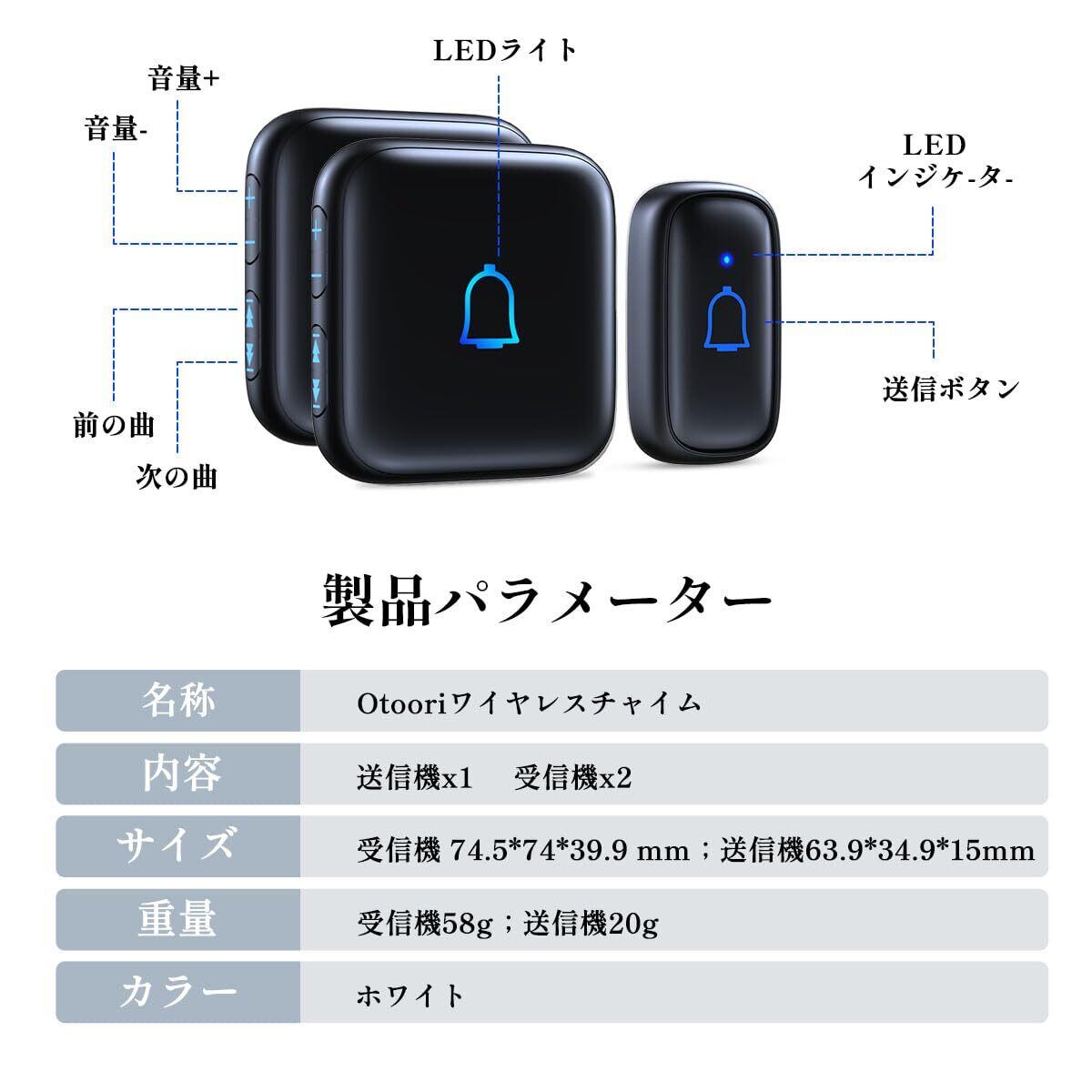 Otoori ワイヤレスチャイム 玄関チャイム IP66防水防塵 送信機電池式 受信機コンセント 115db大音量 300M無線範囲 配線工事不要 取付簡単 7段階音量調節 メモリ機能 60種以上メロディー 音と光で呼び出し LED提示 増設可能 インターホン (1送信機+2受信機)