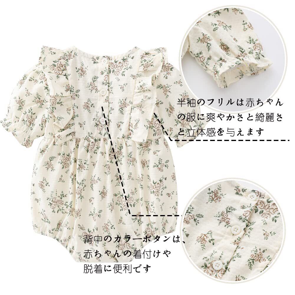デザイン‐ロンパースがフラワープリントの総柄で甘い雰囲気たっぷりです。パフスリーブと肩にあしらったフリルで女の子らしくかわいいです。高めのウエスト切り替えラインで脚長バランスに。