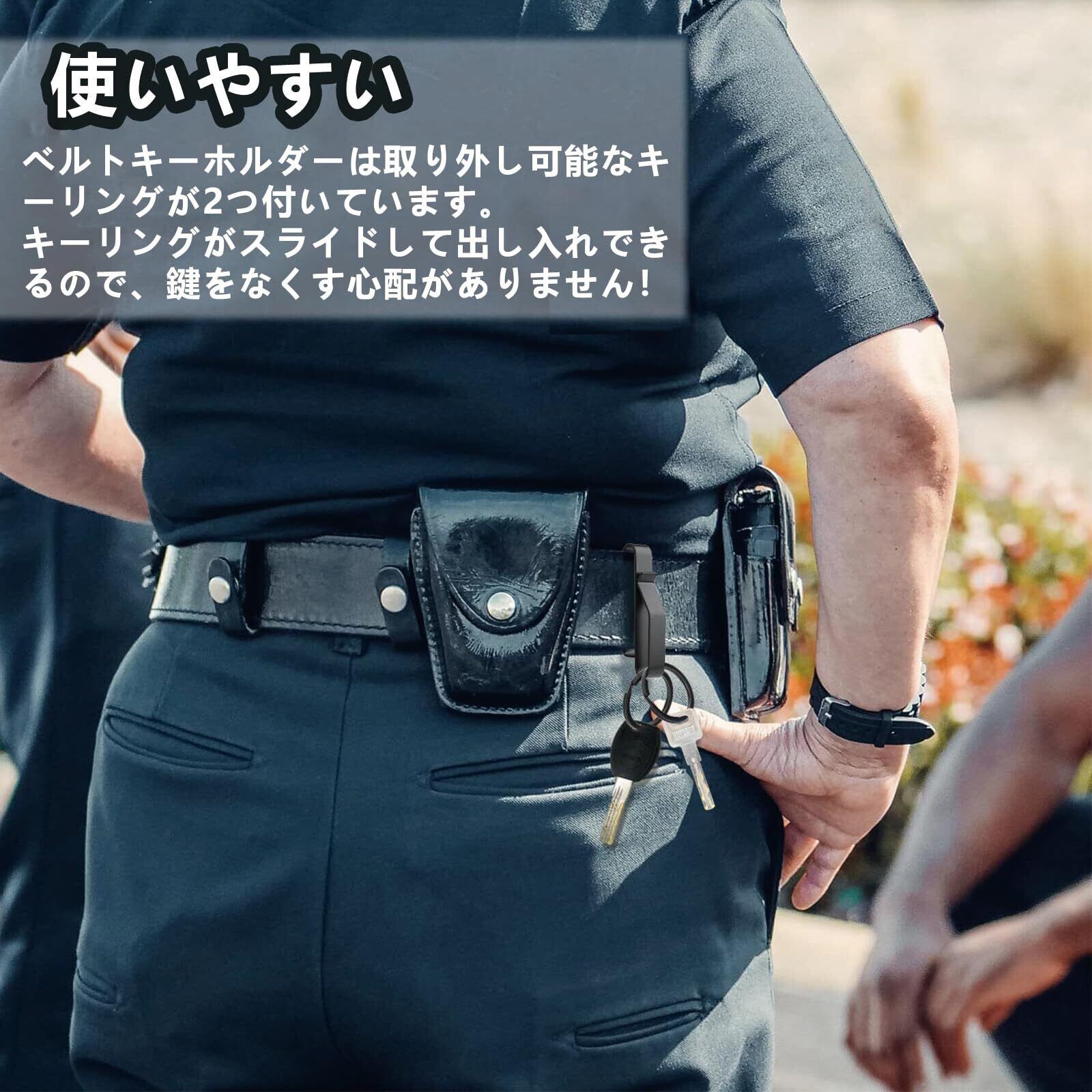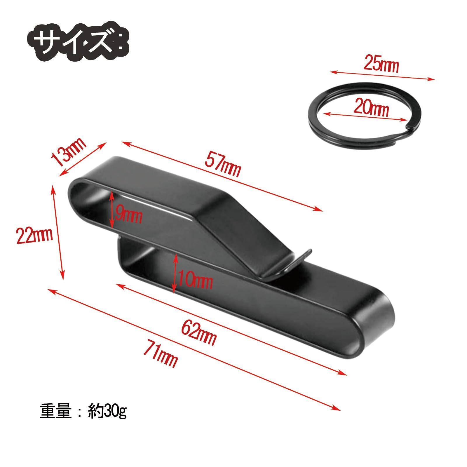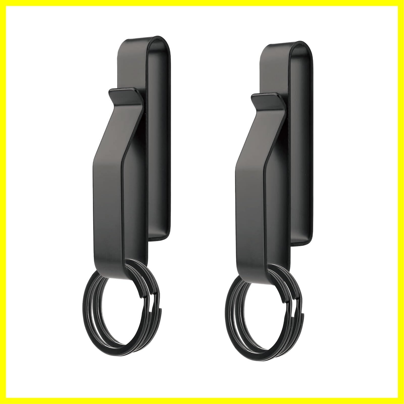 【商品情報】ベルトキーホルダー、素材:高炭素ステンレス鋼、カラー:ブラック、サイズ:7.1 x 1.3 x 2.2 cm、重量:約30g/セット、梱包内容:ベルトキーホルダー*2個、取り外し可能なキーリング*4個、取扱説明書*1冊。