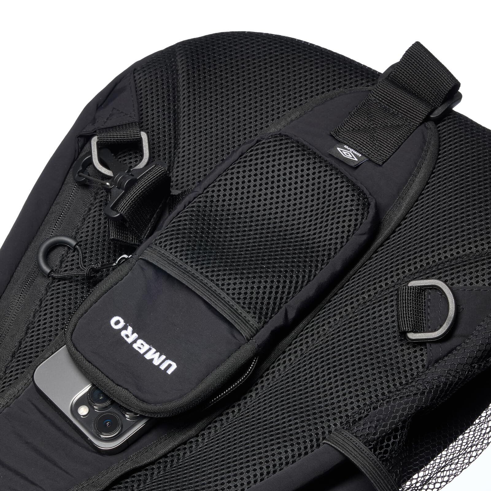【収納】外側ファスナーポケット×2 背面ファスナーポケット×1 メッシュポケット(ボトルホルダー)×1 ショルダー部メッシュポケット×1 ショルダー部ファスナーポケット×1 内部クッション付きオープンポケット×1