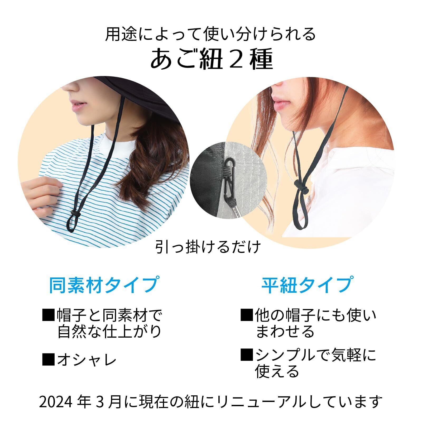 機能リスト UVカット99% UPF50+ あご紐付き(2種類付属) 折りたたみ可能 サイズ調節機能(56~57.5cm) つば先ワイヤーで角度自由自在! 手洗い可
