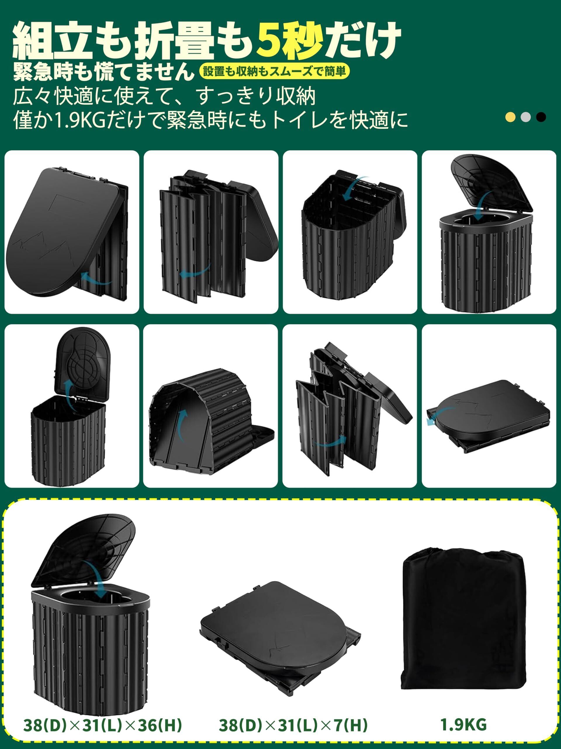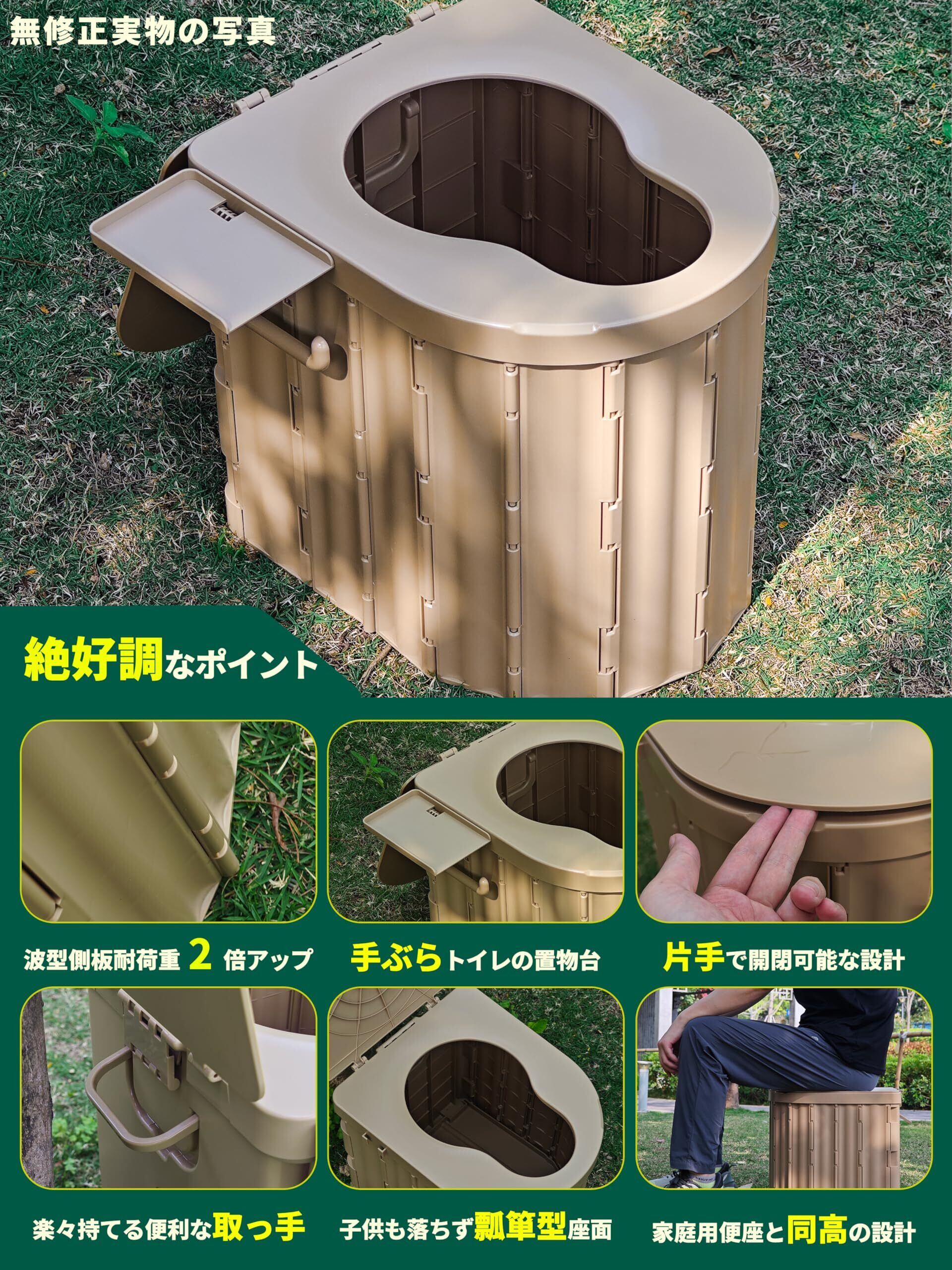多様シーンと大体重にも対応:アウトドア・断水・高速渋滞・介護など、あらゆる状況で快適にご利用いただけます。材質と構造を徹底的に進化、従来品により耐荷重2倍もアップ、最大200kgの重量も対応!さらに、収納時にも場所を取らないコンパクト設計で、いつでもどこでも便利にご利用いただけます。