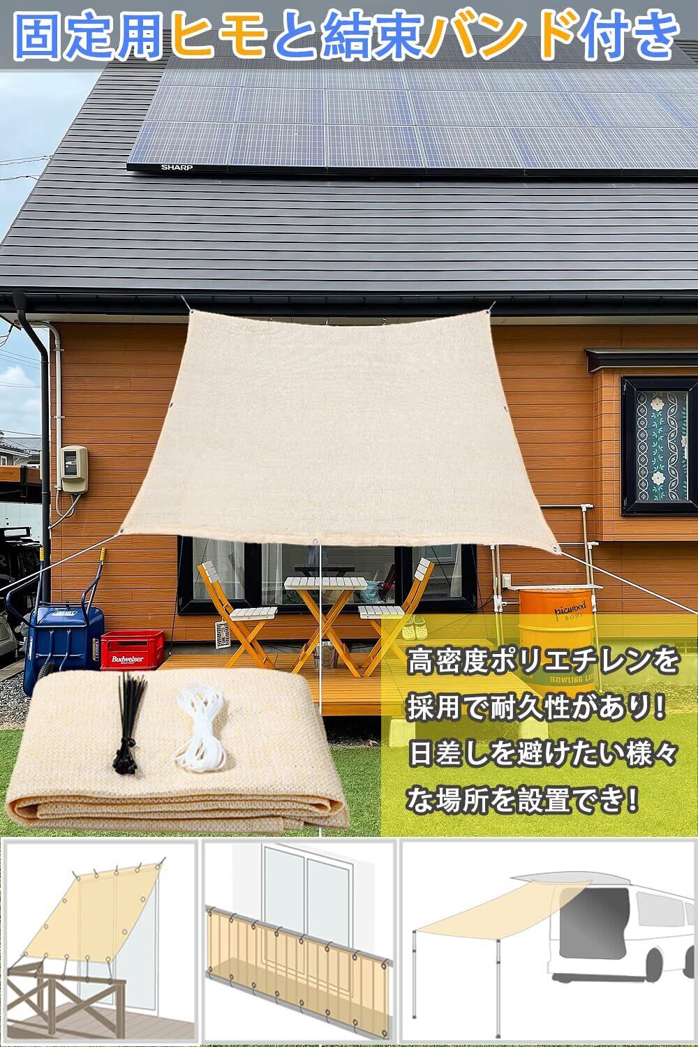 ①、【商品仕様】カラー: ベージュ、サイズ: 横100×縦200cm、ハトメ個数: 10個、パッケージ内容:シェード*1、取付紐約1.5m*4本+結束バンド20本、日本語取扱い書*1、素材生地:約185GSMの高密度ポリエチレン(HDPE)高耐久素材を使用しており、磨耗に強く、耐久性に優れています。