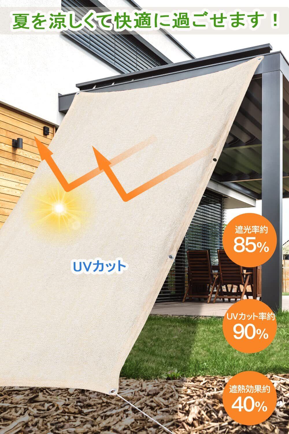 ②、【uvカット・断熱・遮光性が良い】:uvカット率約90%、断熱効果約40%、遮光率約85-90%です。紫外線をカットすると同時に熱気を逃し、シェード下の空間がより快適になるよう工夫されています。通気性もに優れているため、日陰での表面温度も下がり、良好な通気性で熱を放出し、風の涼しさを感じることができる。 そのため、夏でも屋外で快適に過ごすことができます。エアコンの使用も抑えられますので、節電に最適です。夏に冷房をつけず省エネでエコな生活をしたい。