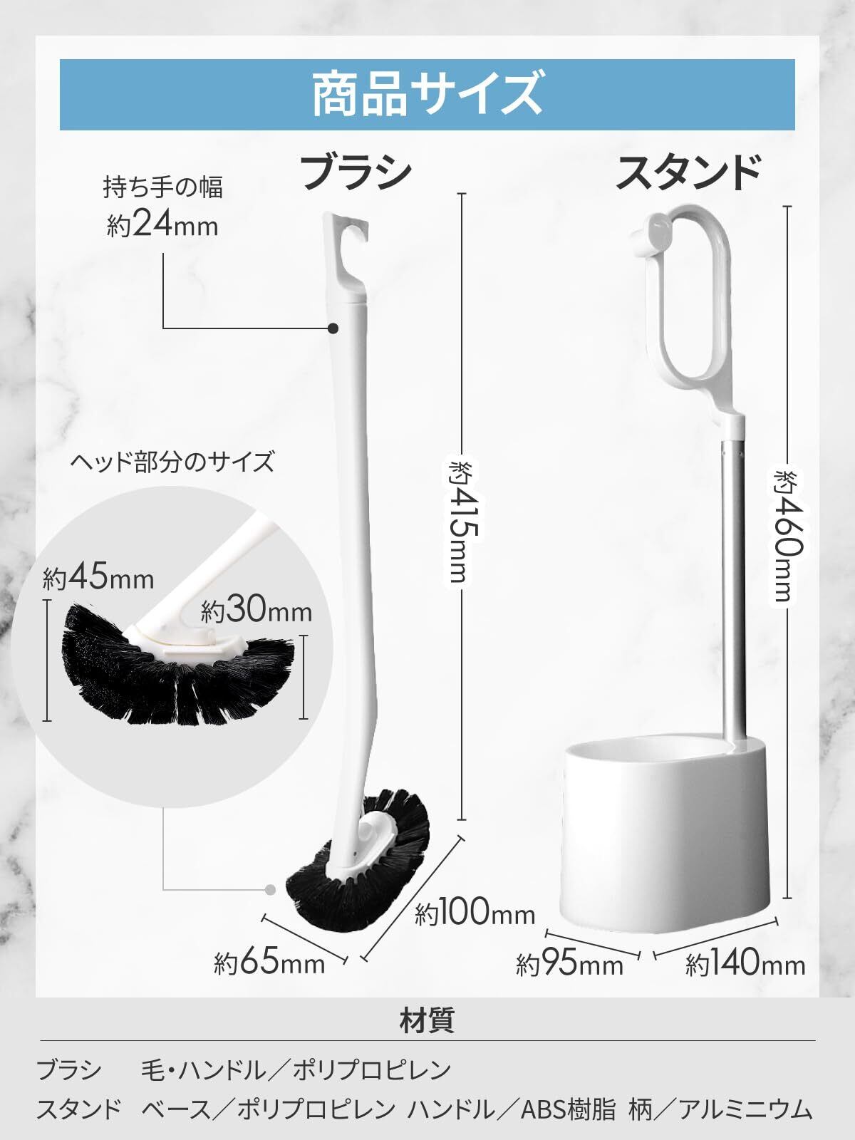 【材質】(ブラシ)毛、ハンドル:ポリプロピレン。(スタンド)ベース:ポリプロピレン。ハンドル:ABS樹脂、柄:アルミニウム 【生産地】中国