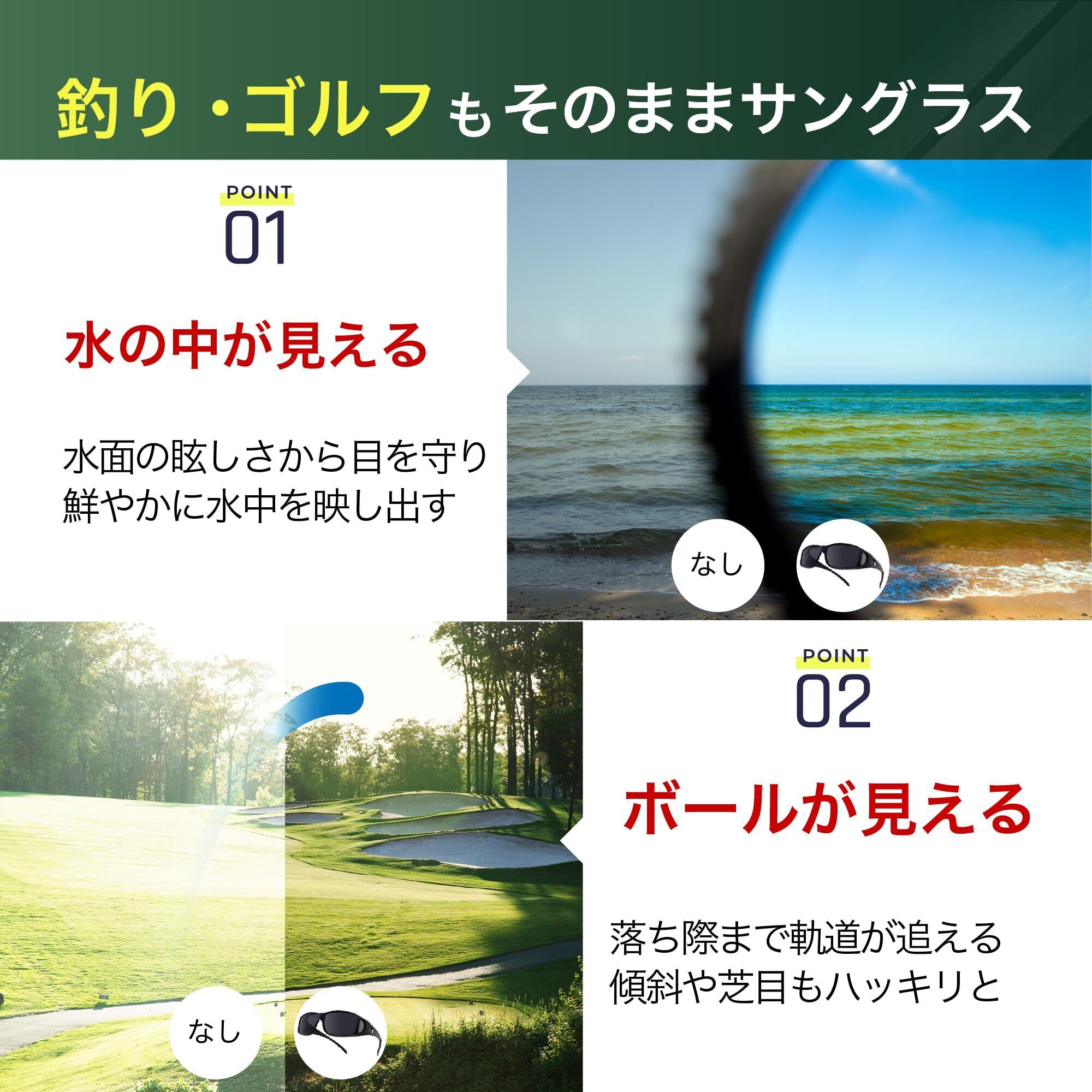 【車の運転・ゴルフや釣りに】偏光サングラスは車の運転やゴルフ釣りのスポーツで太陽の眩しさを軽減し、見やすくクリアな視界を確保します。