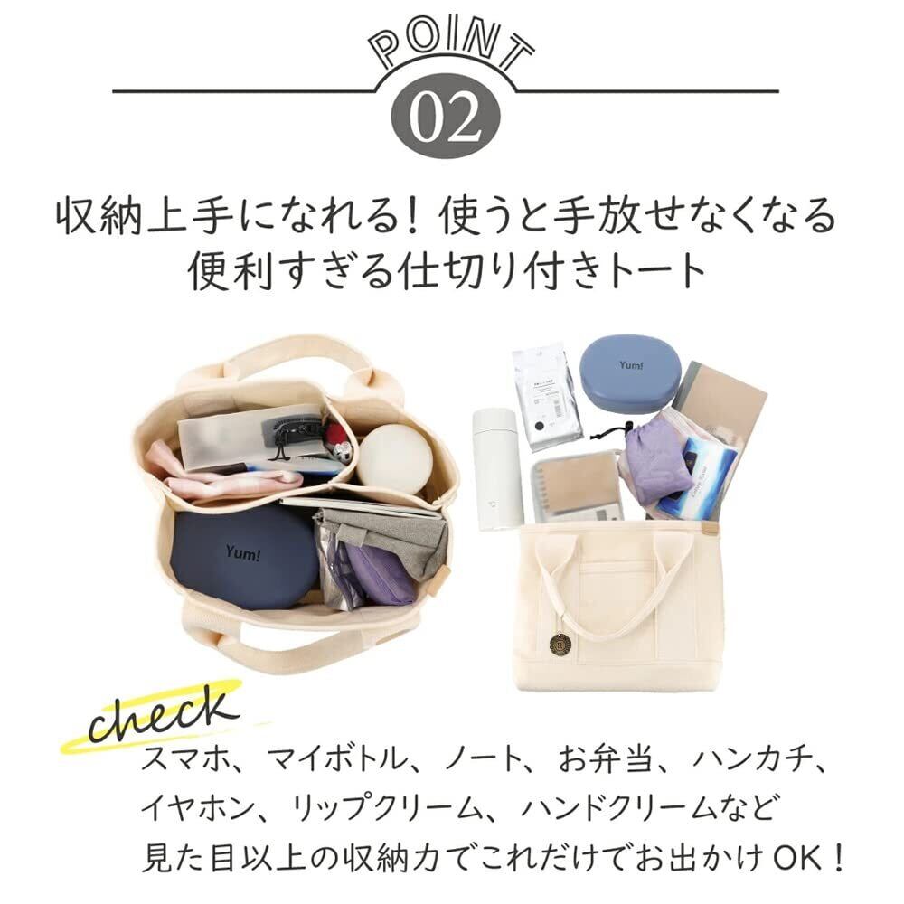 サプライズ:3つの仕切りと2つのポケットでスッキリ収納できるミニトートバッグ。 仕切りがあるので荷物を綺麗に整理整頓して入れられます。見た目以上の収納力と機能性。