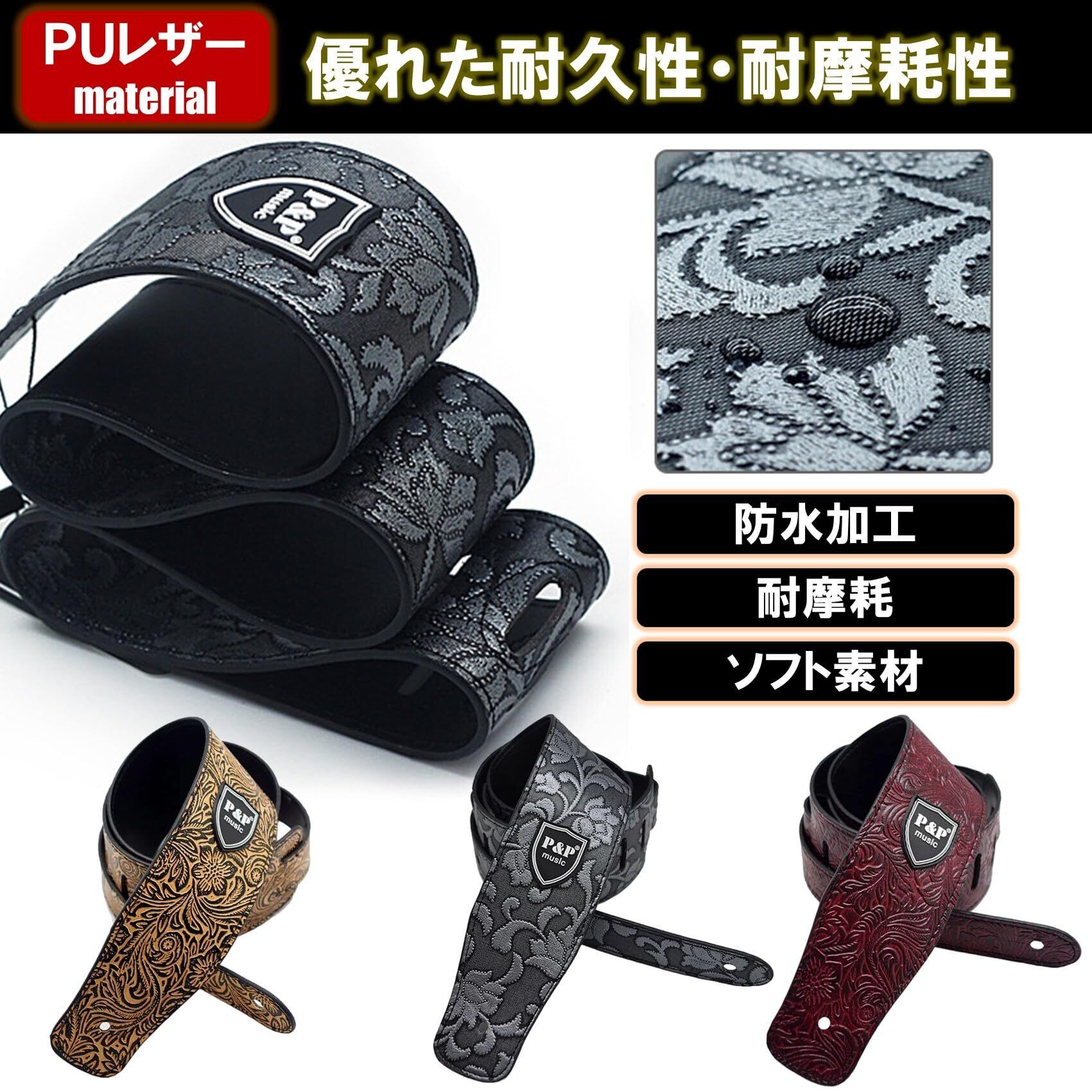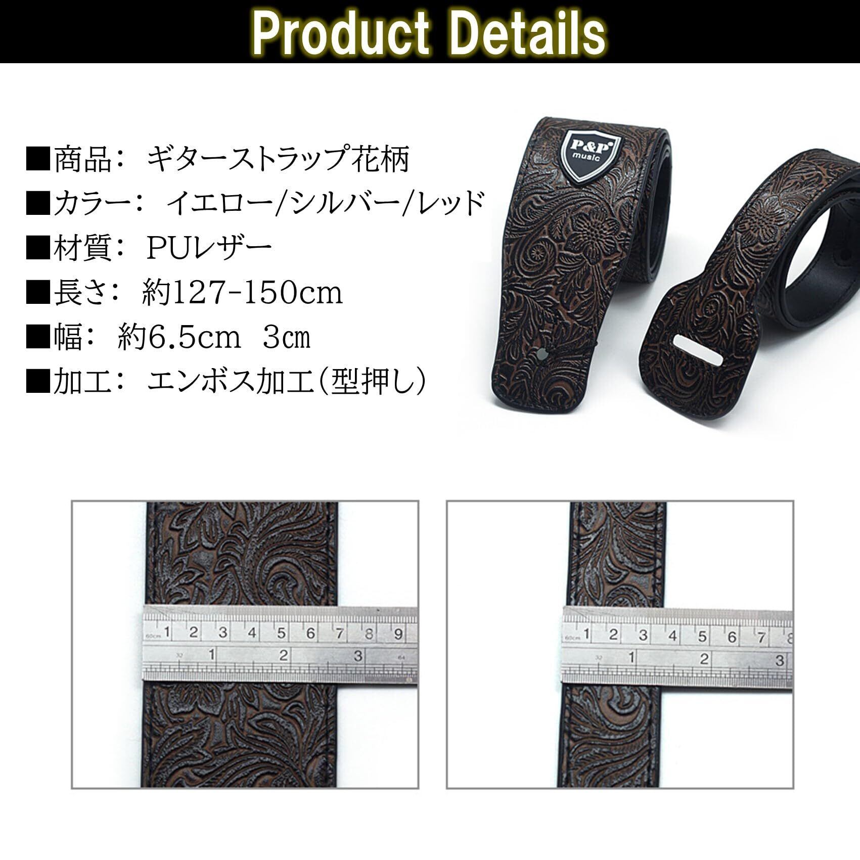 商品詳細:ギターストラップ花柄 【カラー】 イエロー/シルバー/レッド 【材質】 PUレザー 【長さ】 約127-150㎝(調整可) 【幅】 約6.5cm 3cm 【加工】 エンボス加工(型押し)