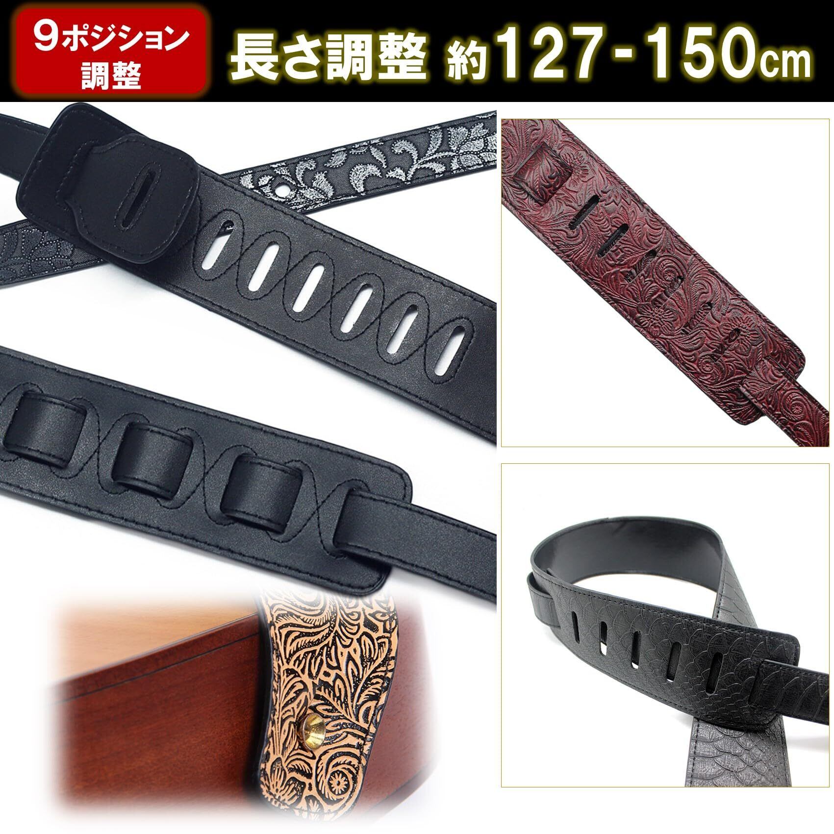 ギターストラップの長さは、9ポジション約127-150cm内で調整可能です。お子様から大人まで幅広くご使用いただけます。