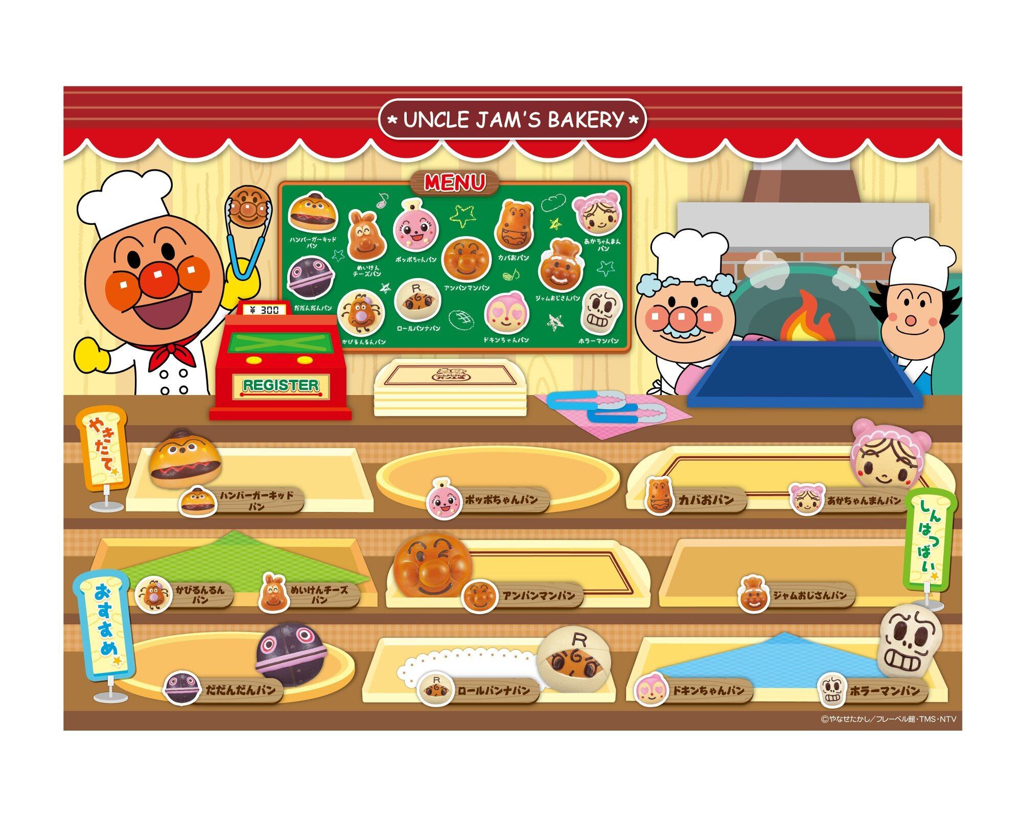 「ジャムおじさんのやきたてパン工場」に新しいキャラクターパンが仲間入り!アンパンマンパン・めいけんチーズパン・ジャムおじさんパン・ハンバーガーキッドパン・ロールパンナパン・ホラーマンパン・ハート目ドキンちゃんパン・だだんだんパン・あかちゃんまんパン・かびるんるんパン・ポッポちゃんパン・カバおパンの全12種類のキャラクターパンと、お店の内装をイメージしたプレイシート、メニューシートのセット。プレイシートを使って、パンセットだけでもお店屋さんごっこ遊びができるよ。