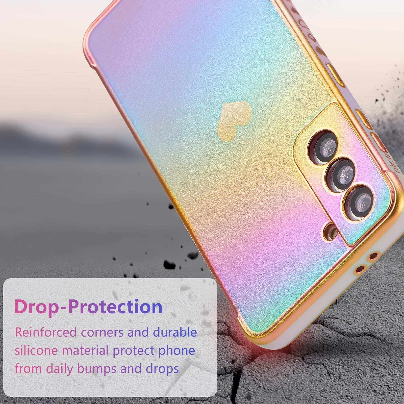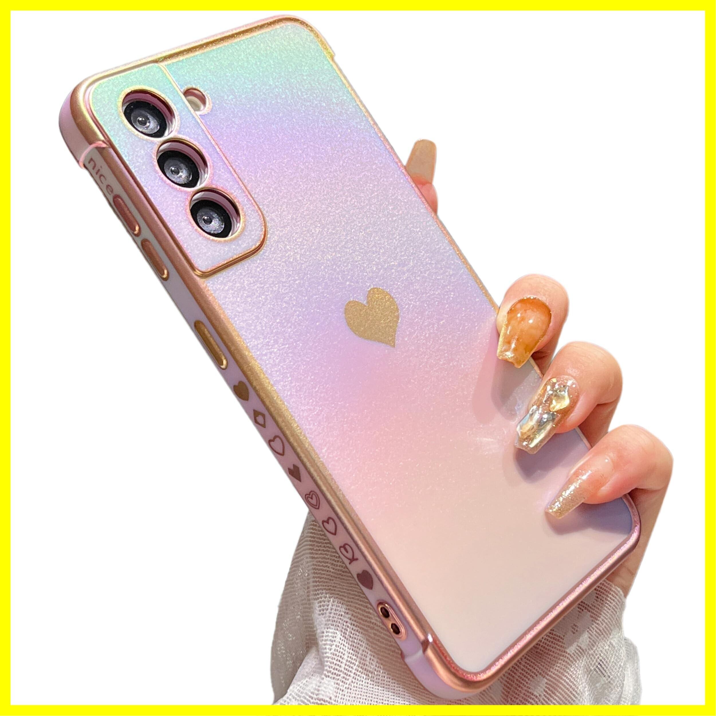 【虹色デザイン】電気メッキ技術により、縁と小さなラブハートパターンを装飾し、メッキされた縁は決して色褪せず、ケース全体が光沢があり、異なる動きや光によって色が変化します; すべてがこのSamsung Galaxy S21ケースをよりスタイリッシュにし、目を引く;女の子と女性のための素敵な贈り物。