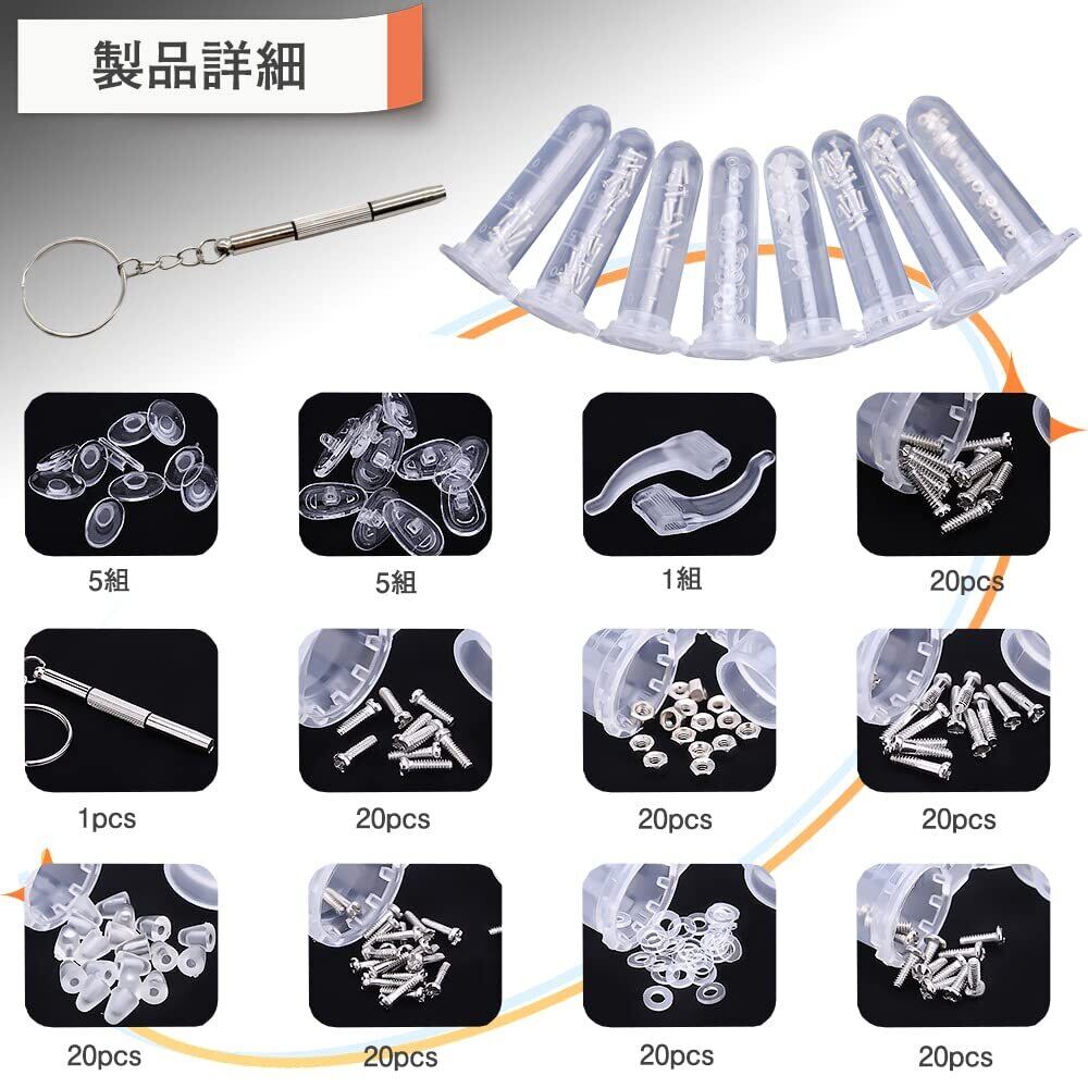 セット内容:ドライバー×1(プラスドライバー、プラスドライバー)、ノーズパッド(シリコン製、ネジ式)×5組、ノーズパッド(シリコン製、プッシュアップタイプ) 5組、シリコンイヤークッション 1組、20(ボトル)×シリコン製ドングリナット、20(ボトル)×メタルスペーサー、ネジ(5種類)1.6×4.0、M1.2×3.6 、M1.4×4.0、M1.4×3.6 、M1.0*3.6各20 ナット、収納ケース付き。