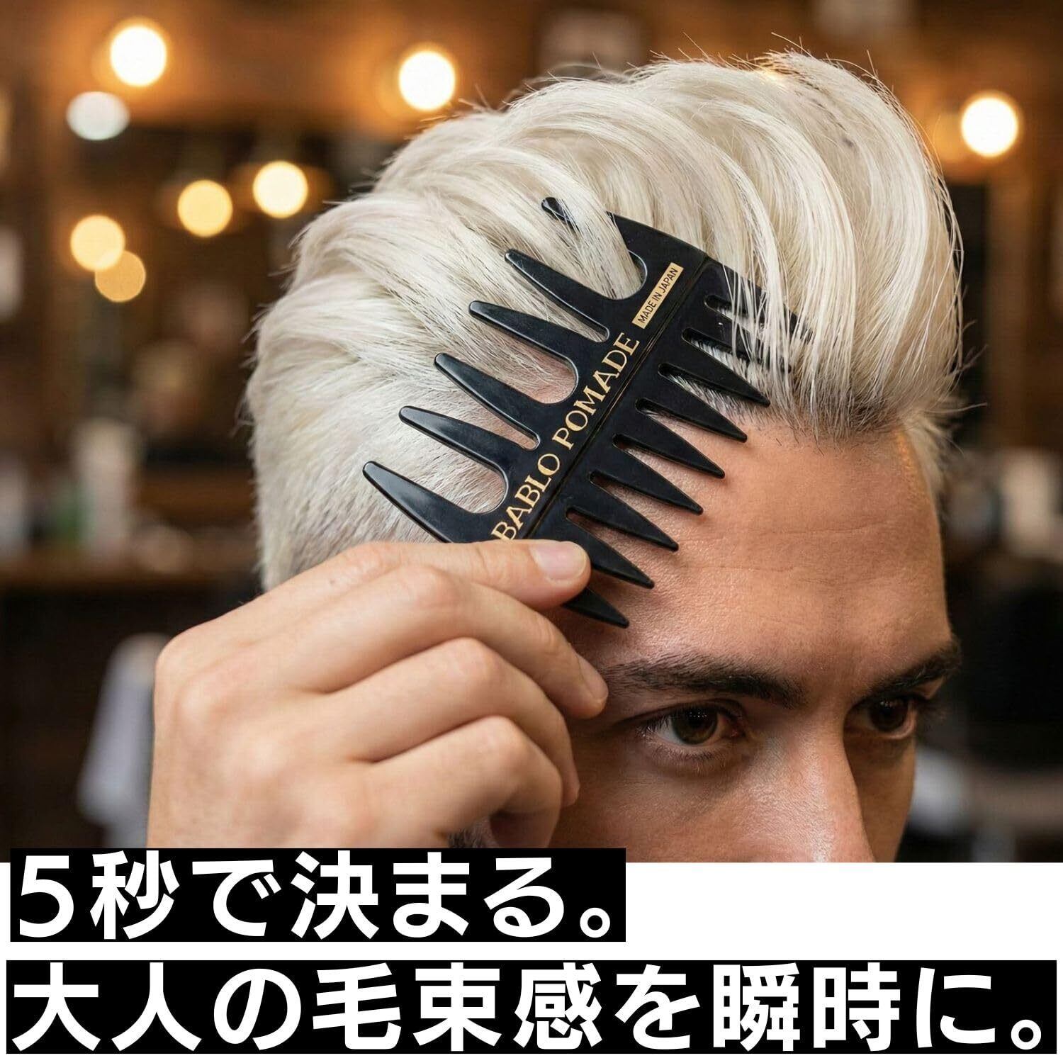 ◆オリジナルコームの説明◆【プロ級の仕上がりを自宅で。精密1mm間隔コーム】 JAPANクオリティにこだわり抜いた“BABLO POMADE”のオリジナルコーム。コーム歯を1mm間隔と極めて狭く設計することで、細かな産毛や短い毛を逃しません。髪を根元からしっかり撫でつけ、一切乱れのないカッチリとしたプロフェッショナルなセットを実現します。 【BARBERスタイルに絶対の精度を】 オールバック、コームオーバー(七三分け)、ポンパドール、ツーブロック、クロップスタイルなど、タイトさとエッジの効いたラインが要求されるクラシカルなBARBERスタイルの仕上げに最適です。狙った通りに、ビシッと、隙なくキメたい男性の必須アイテムです。