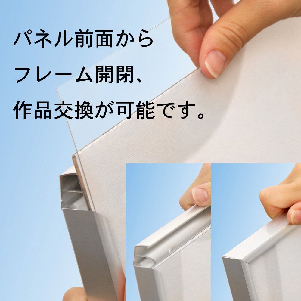 【A2サイズ】作品交換が簡単なアルミ製の軽量前開き式フレーム。フレーム色はすっきりとしたツヤ消しブラックです。