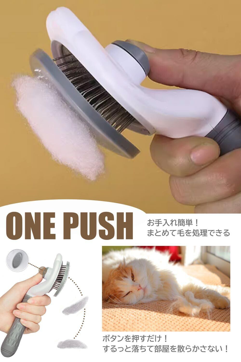 【 簡単!ワンプッシュ式 】 ブラシの背面にボタンがついており、それを押すと取れた毛を一気に除去することが可能です。ワンプッシュ式でお手入れも簡単なので、手間がかからずブラッシングができます毛が散らばらないので、洋服についたりお部屋に落ちたりを防止してくれます。