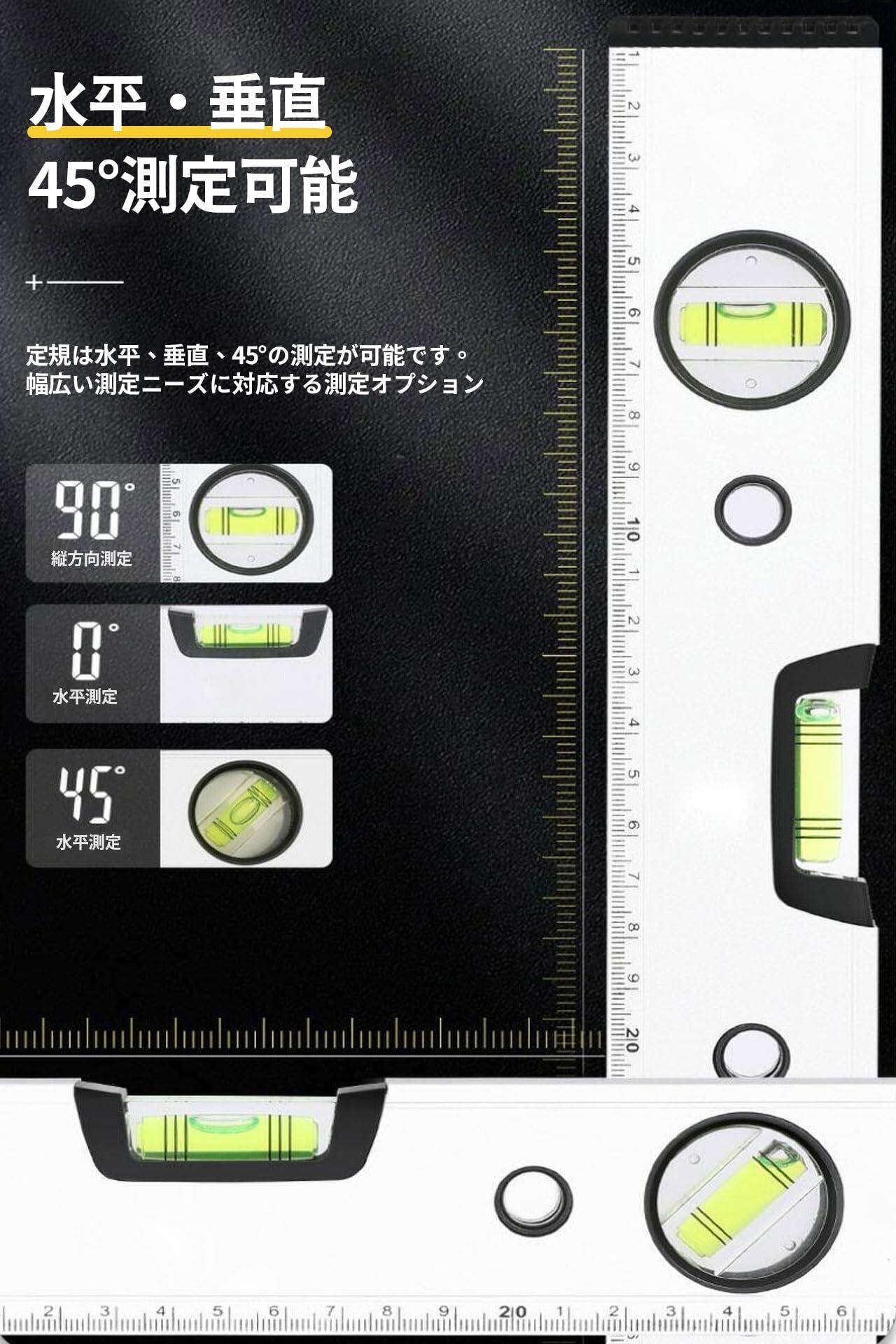 【多用途のさしがね】実用性と機能性を兼ね備えたスタンダードな水平器です。アプリケーション 建築、棚の設置、土木、木工、家庭のDIYプロジェクトなどの水平、45°測定、垂直測定等に適用されます。