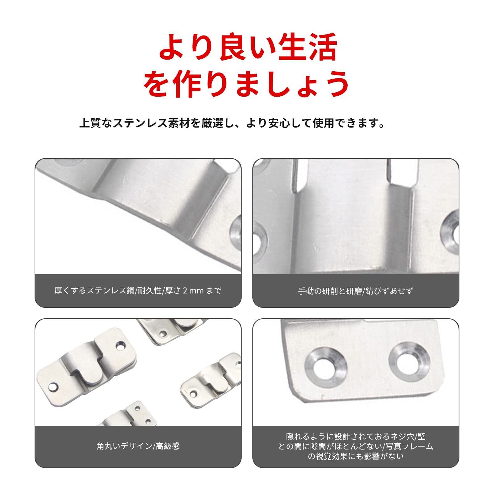 【高品質ステンレス鋼】この商品の額縁用吊り金具は、高品質のステンレス鋼製で、耐久性に優れ、錆びにくく、長期間使用できます。また、角丸いデザインや細かく磨かれた表面が美しく、高級感があります。
