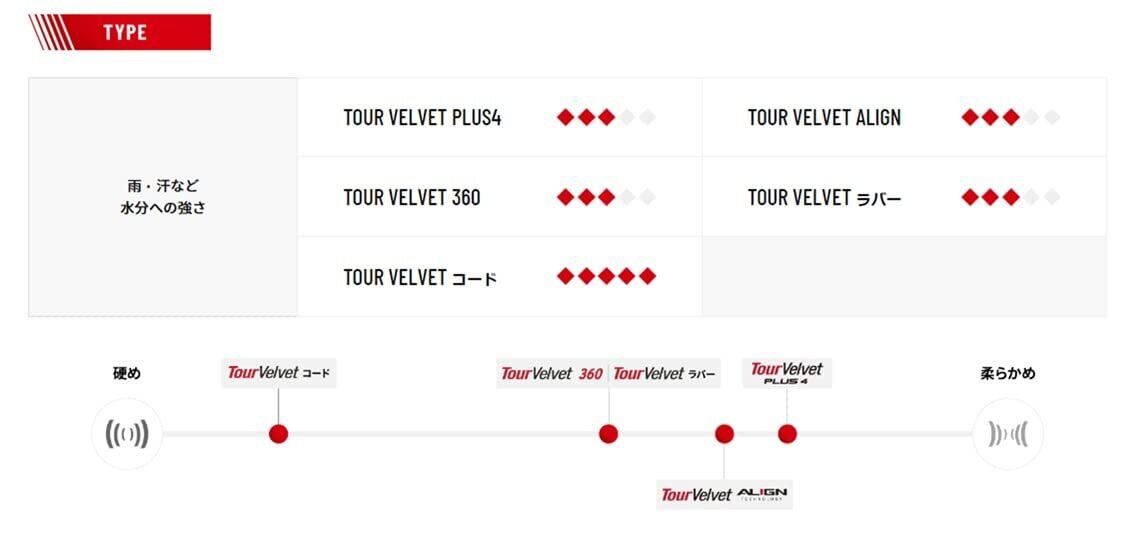 2012年世界4大メジャートーナメント使用率第1位。 高級で最新鋭のブレンドラバーとコンピュータでデザインされた滑りにくい表面パターンを組み合わせプレー性能、快適性、信頼性を最大限に実現。ツアーベルベット・ラバーは、多くのクラブがデザインの基礎を作る基準となっている。標準重量52g(M60X)