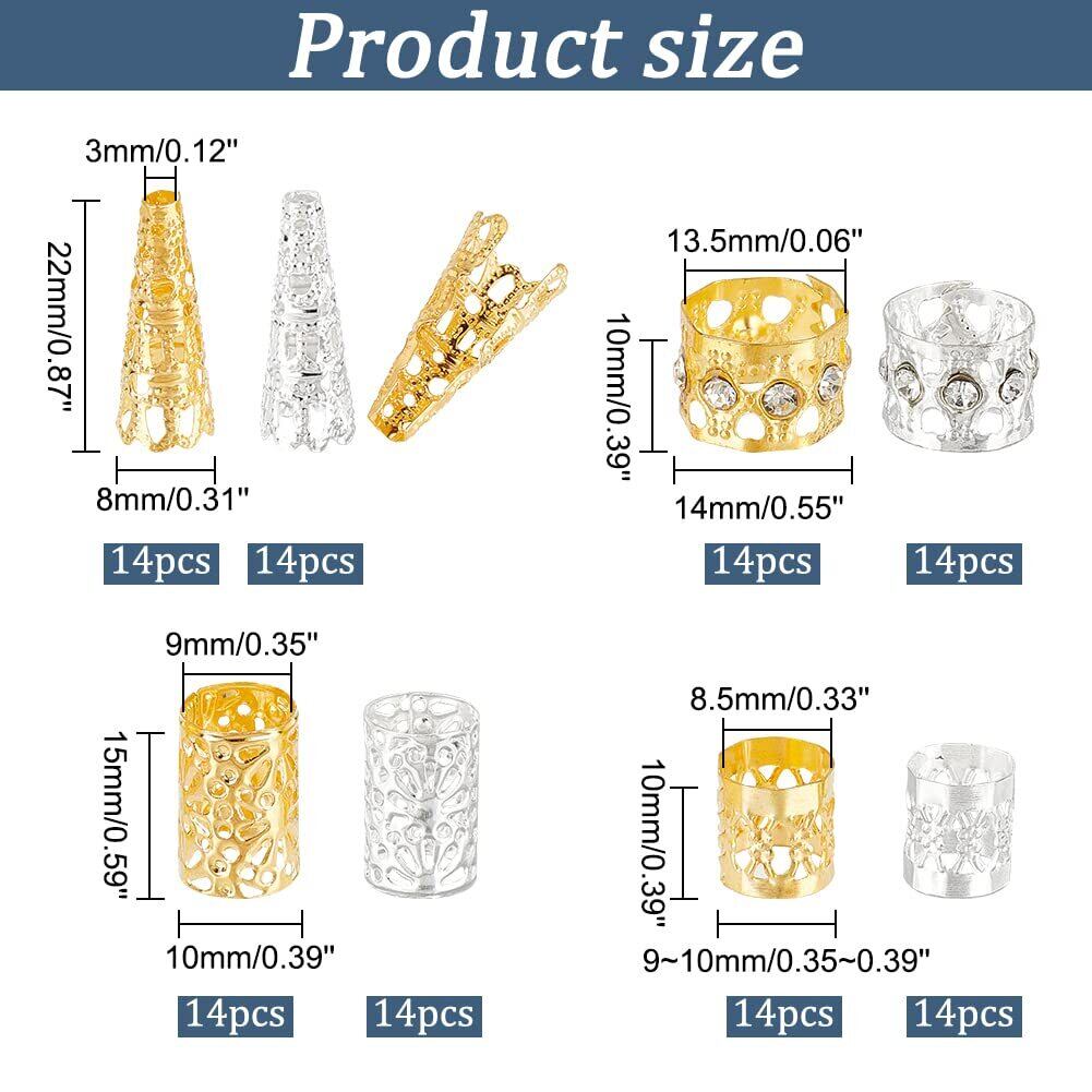 サイズ:3つのスタイルの84個のブレードビーズと28個の中空ビーズキャップが含まれています。 いずれもカラーはゴールドまたはシルバーです。 ビーズキャップのサイズは約22x8mmで、穴の直径は約3mmです。 ヘアアクセサリーは約10x14mm、15x10mm、10x9~10mmです。
