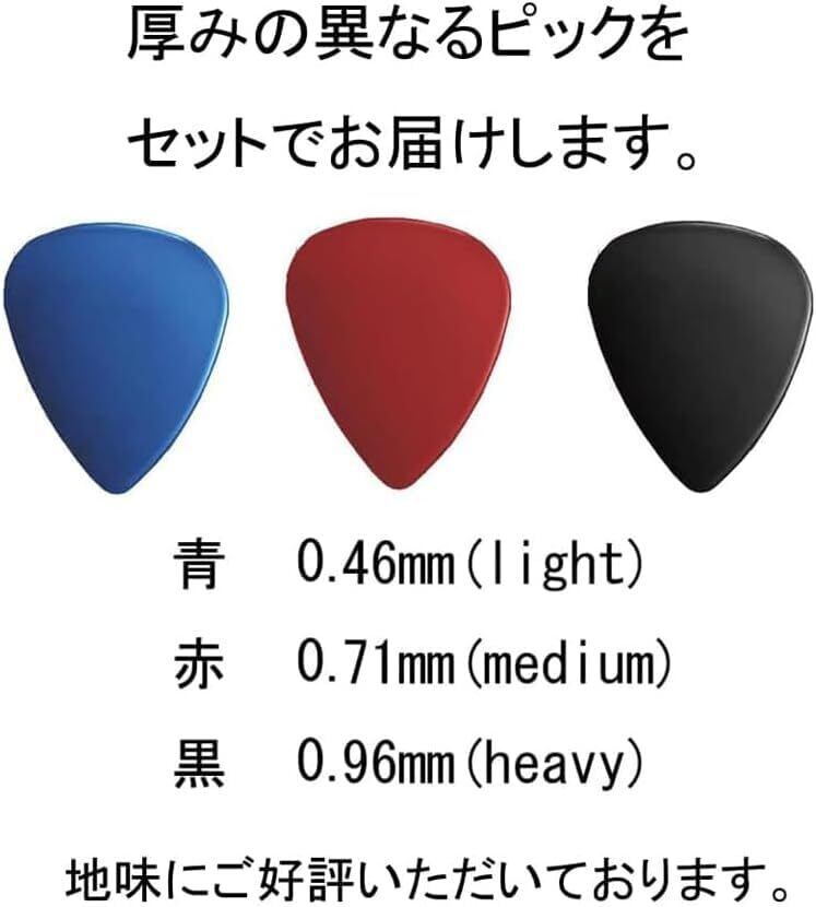 厚みの異なるピックが3種付属します。0.46mm、0.71mm、0.96mmの3種となります。