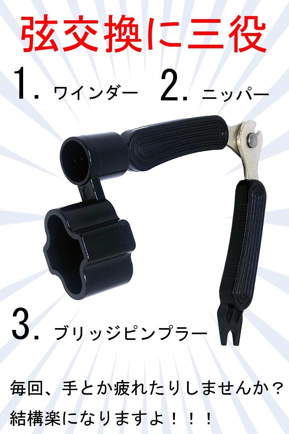 ギターの弦交換に必要な機能が揃っています。弦をカットし、ブリッジピンを軽く外し、ワインダーで弦を巻くことができます。