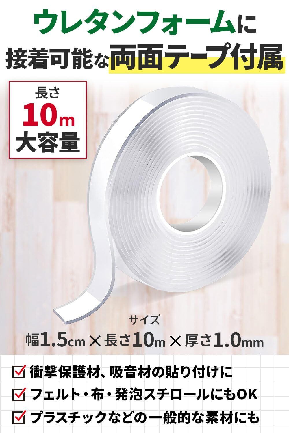 【 貼り付け方法に困らない 】 圧縮大容量パッケージは、なんとスポンジ用両面テープ付き。テープも20mと大容量ですので、ケチらずしっかりとウレタンフォームを貼り付ることができます。