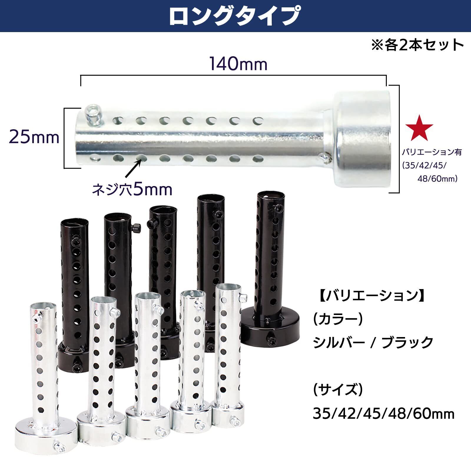 【バリエーション】カラーはシルバーとブラックの2色展開。長さはロングタイプ(全長約140mm)とショートタイプ(全長約80mm)、取付部外径35/42/45/48/60mmからマフラーサイズに最適なサイズをお選びいただけます。愛車のデザインを損ねず消音効果を発揮します。