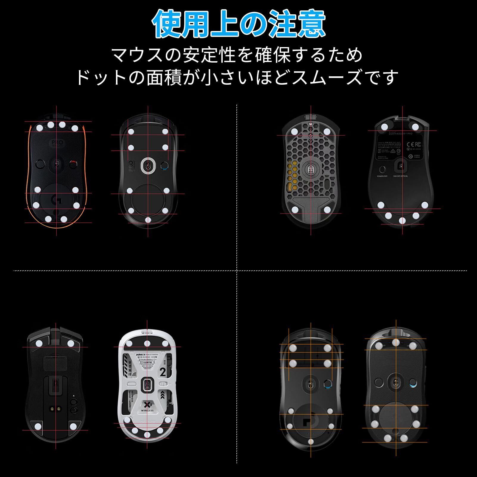 スソールとマウスパッド表面の摩擦を軽減し、耐久性に優れています。 【超スムースな使用感】マウスの安定性と操作精度を高め、マウスの動きを改善します。より快適で正確なマウス操作を実現します。 ピュアPTFE(フッ素樹脂)を採用し、マウスの安定性と操作精度を向上。 【ROUNDED EDGE FINISH】 ユニークな丸みを帯びたデザインで、柔らかい布製マウスパッドを靴底に引っ掛けることなく快適に使用できます。様々なタイプのマウスパッドに対応し、より快適で正確なマウス操作を実現します。 【3M粘着層/簡単取り付け】粘着面の粘着層は3M粘着剤を使用し、超シルクの接着強度を確保し、テープがマウスにしっかりと貼り付きます。