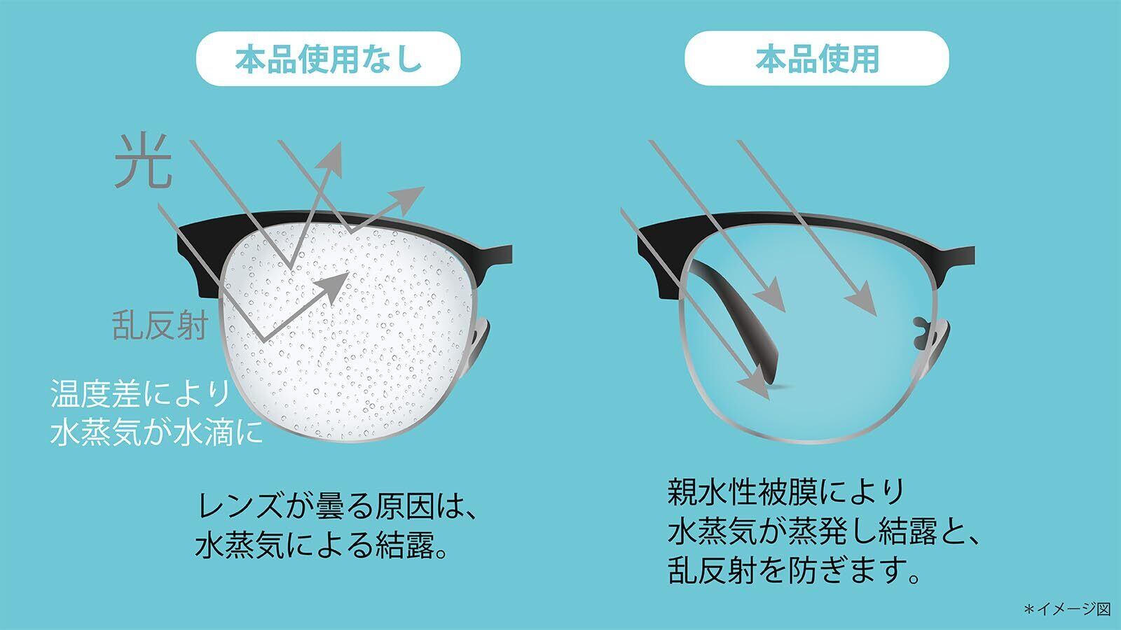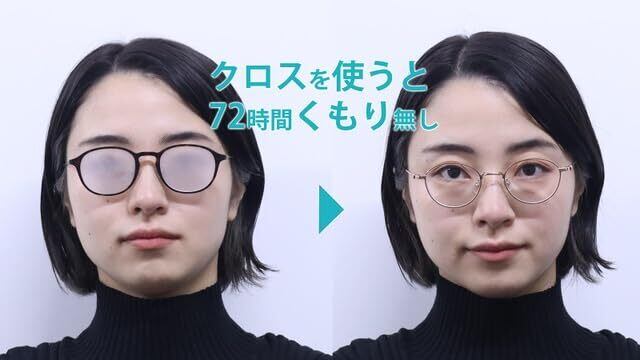 1度拭くだけで72時間、眼鏡・洗面所の鏡・車のミラー、バイクのゴーグル等が曇りません。72時間持続、300回使用可能なドライタイプを化学が3年の年月をかけて開発。静電気を防ぎ花粉、黄砂、PM2.5などのホコリから眼鏡・スマホ・カメラ等のレンズを守ります。