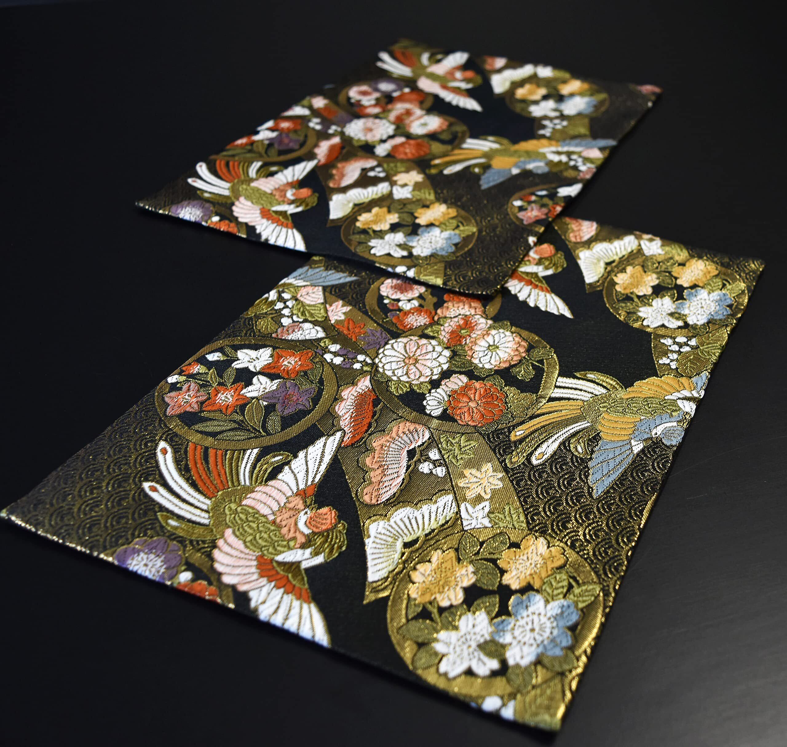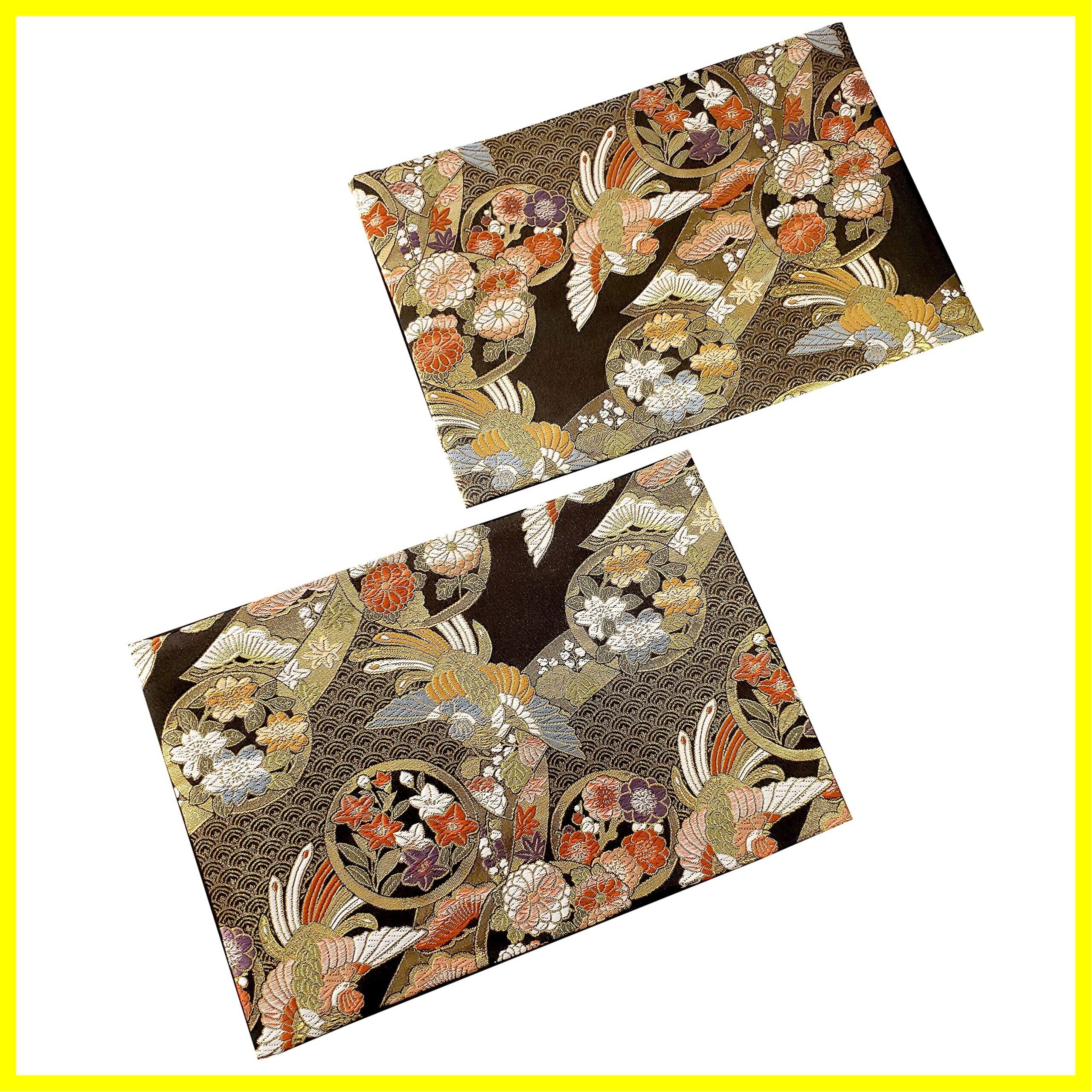 日本製 1枚サイズ:23×33㎝ 包装済箱入サイズ34×24×3㎝ 材質:金襴部分 ポリエステル100% 黒無地部分:綿100%
