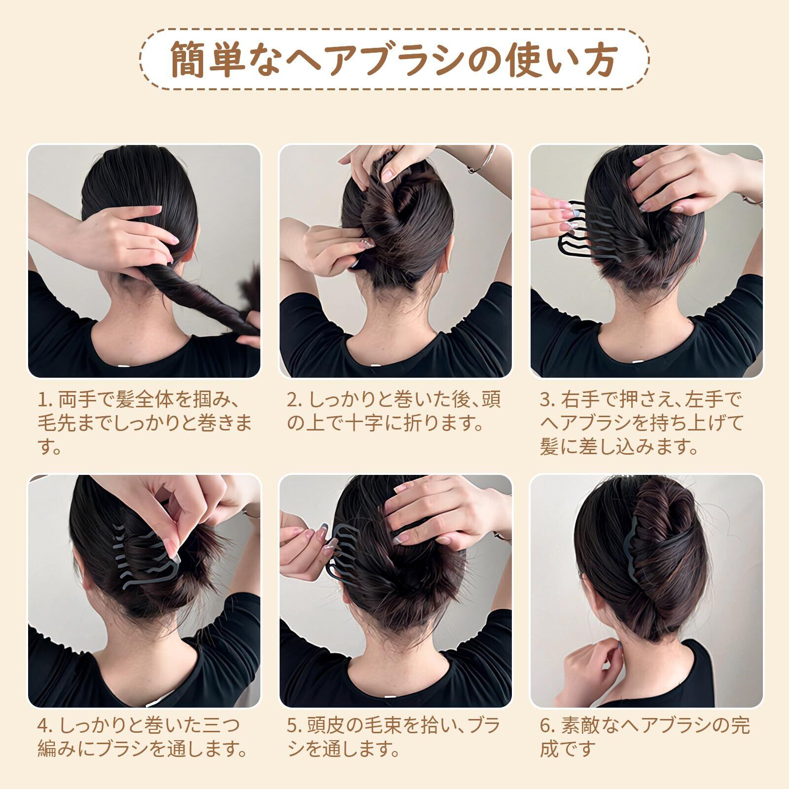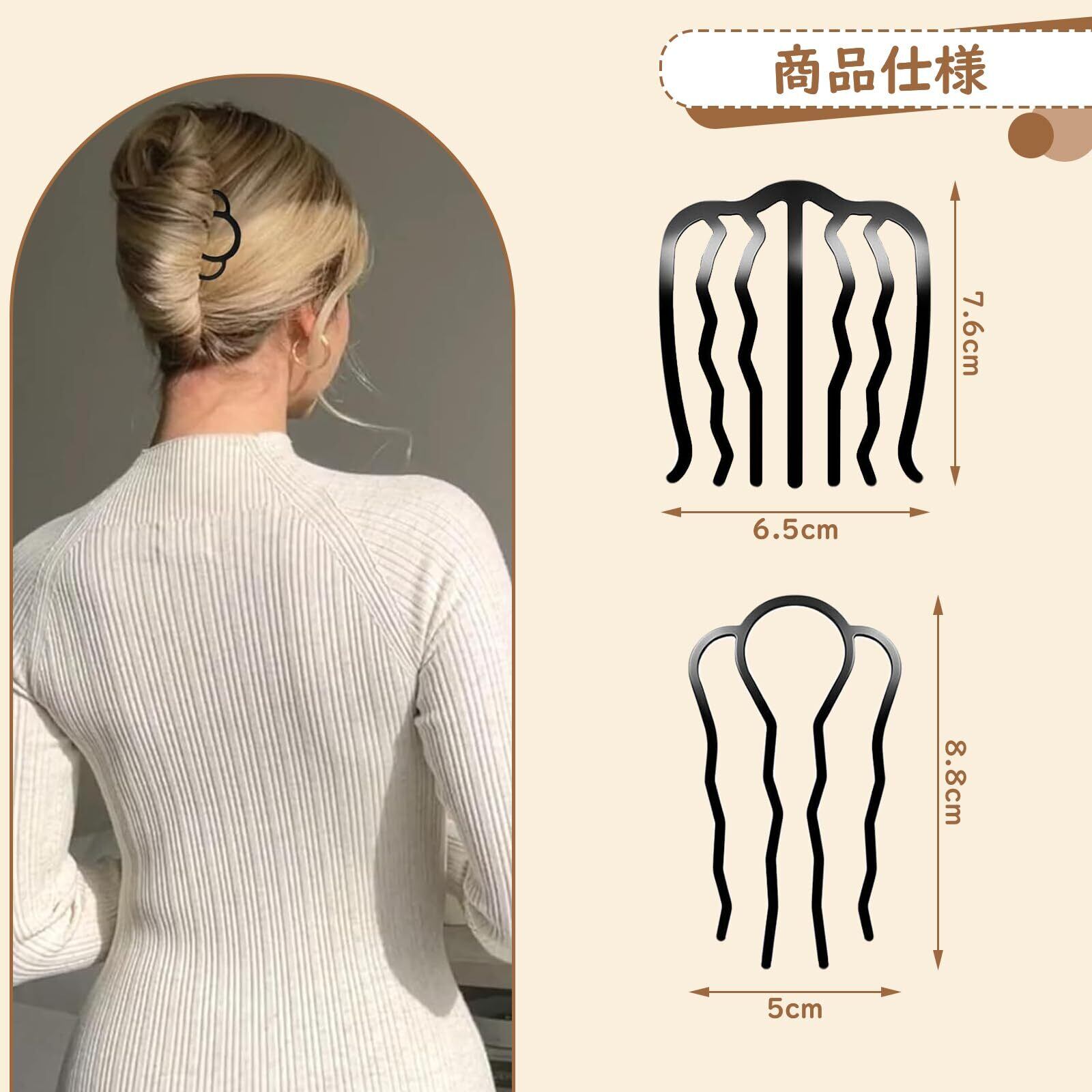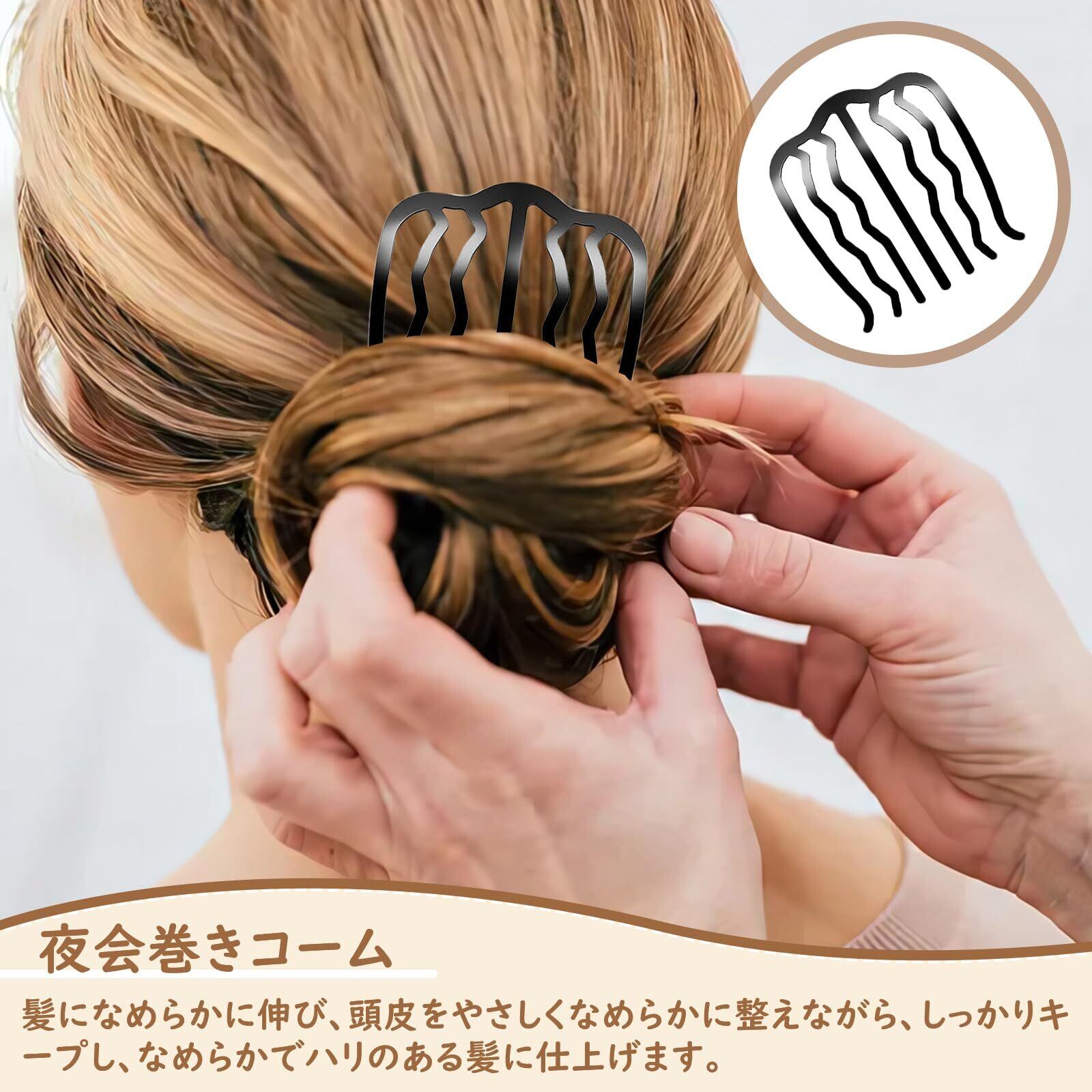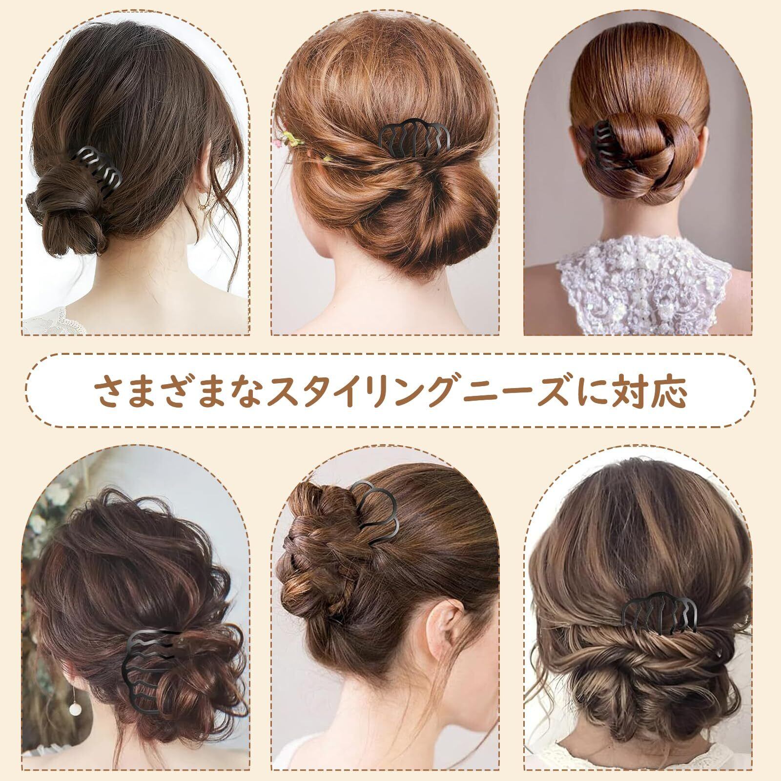 【上品な夜会巻きコーム】夜会巻きコームは髪にスムーズに挿入でき、頭皮を優しく撫でながら、しっかりと形を整え、滑らかでしっかりとしたスタイリング効果をもたらします。ベーシックなスタイリングからシンプルなスタイリングまで、しっかりとサポートします。