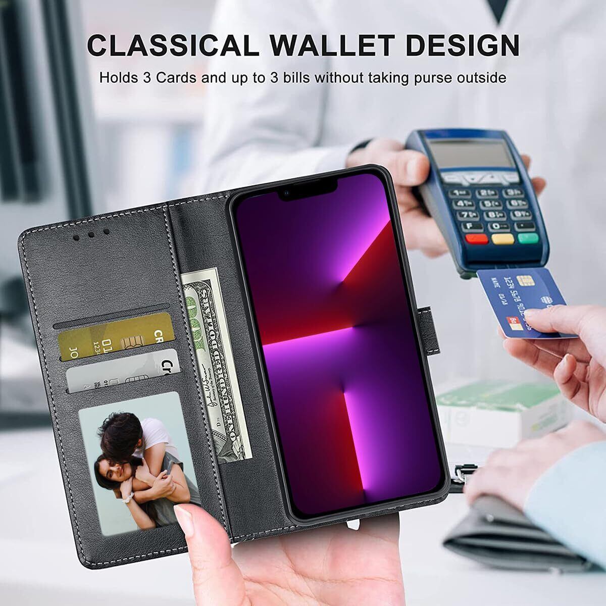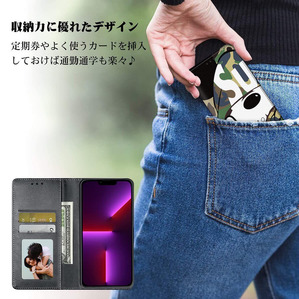 【3.機能満載の手帳型ケース】 このケースには、横置きスタンド機能が付いていますので、好みの角度で動画鑑賞や読書などを楽しむことができます!また、内部には3つのカード入れとフリーポケットがあるので、名刺や定期券の収納に最適です!便利さと実用性を兼ね備えた手帳型ケースです!✨✨
