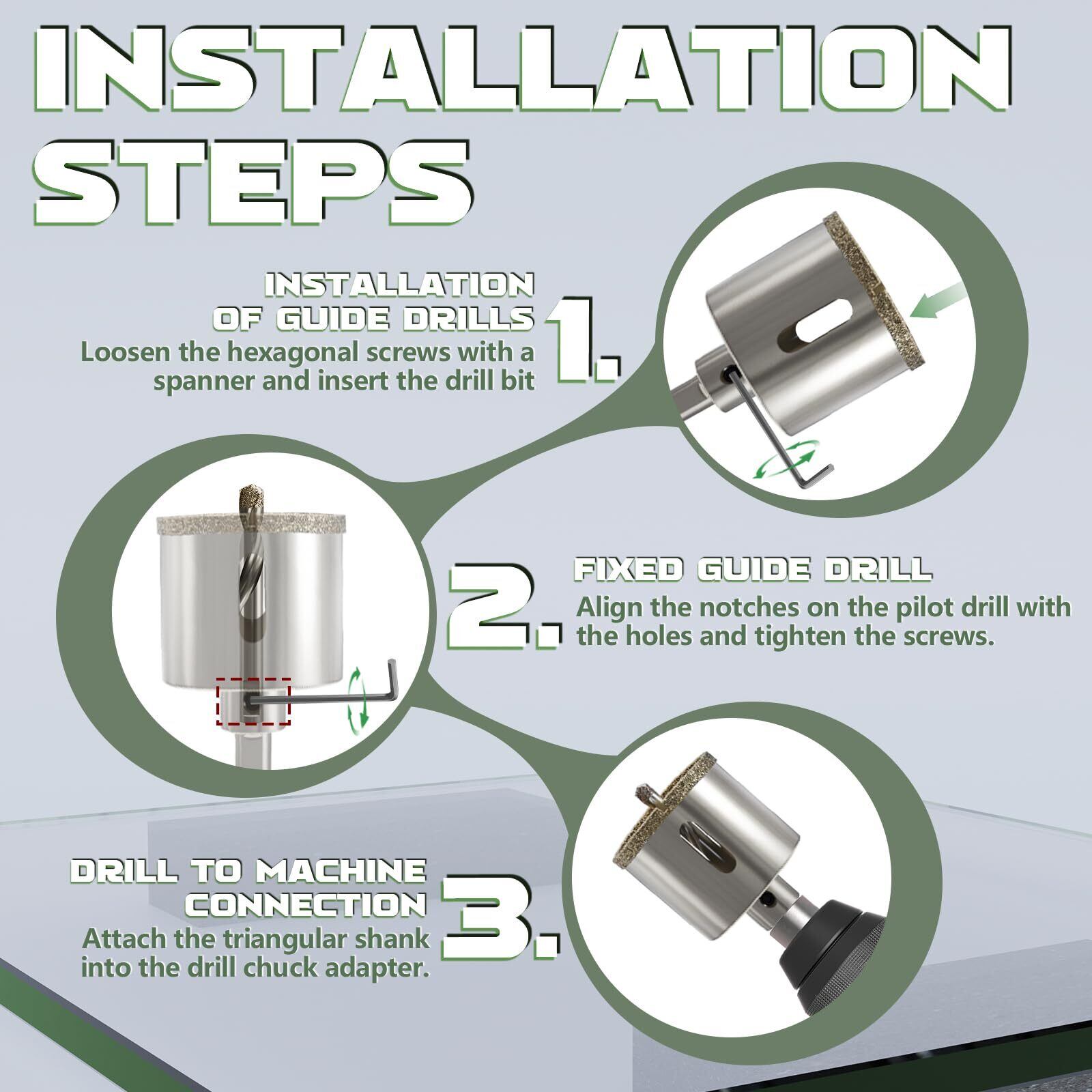 【高品質な素材】私たちのガラスホールソーは、1本のポインテッドドリルビット、1本のフラットドリルビット、1本の六角レンチが付属しています。位置決め用のパイロットドリルビットの先端は高品質のダイヤモンドで作られており、頑丈な硬化スチール製のボディと、表面にはニッケルメッキコーティングが施されているため、高い硬度、防錆性、耐食性、耐久性を確保しています。
