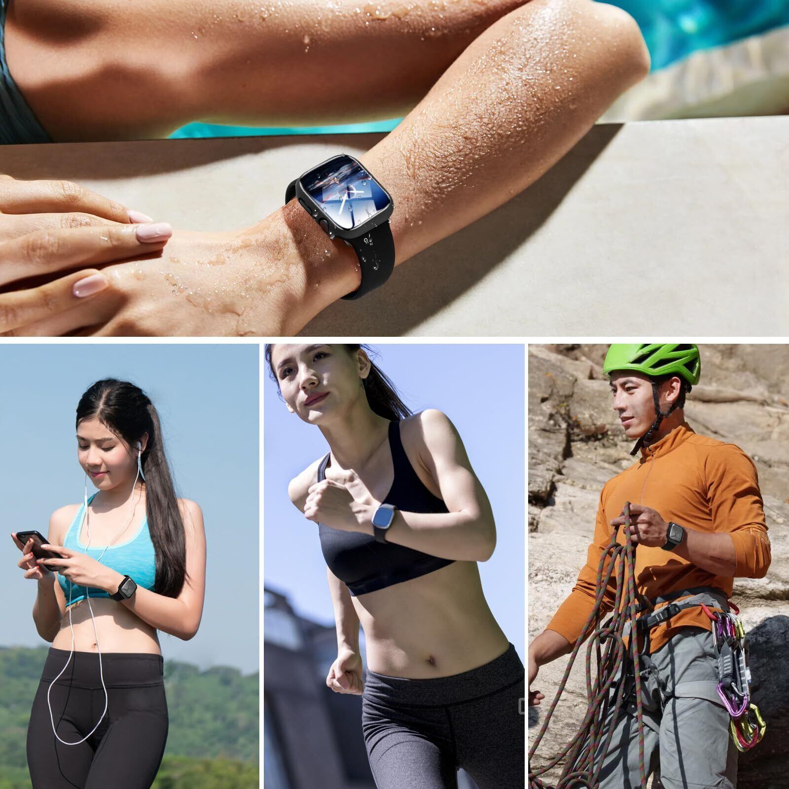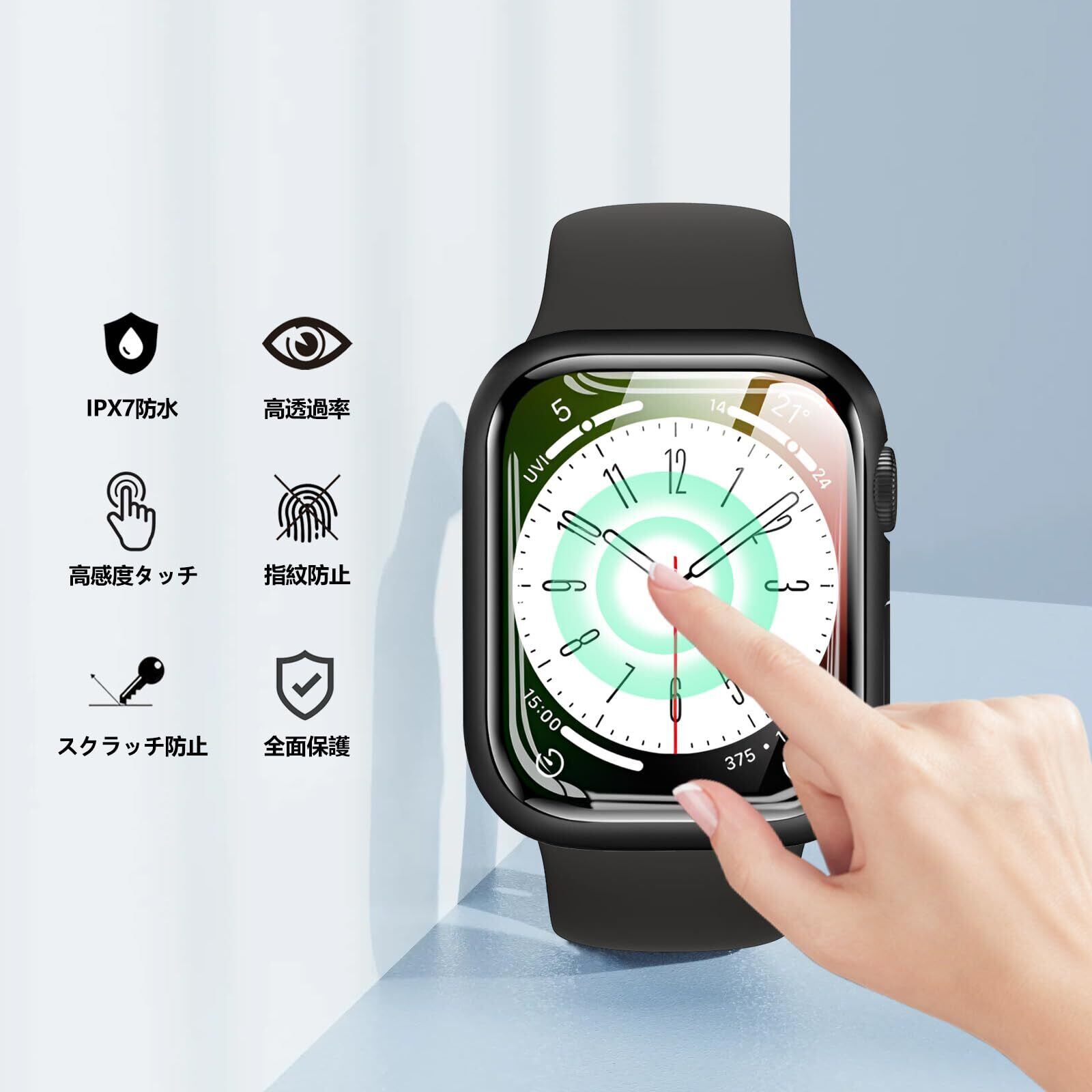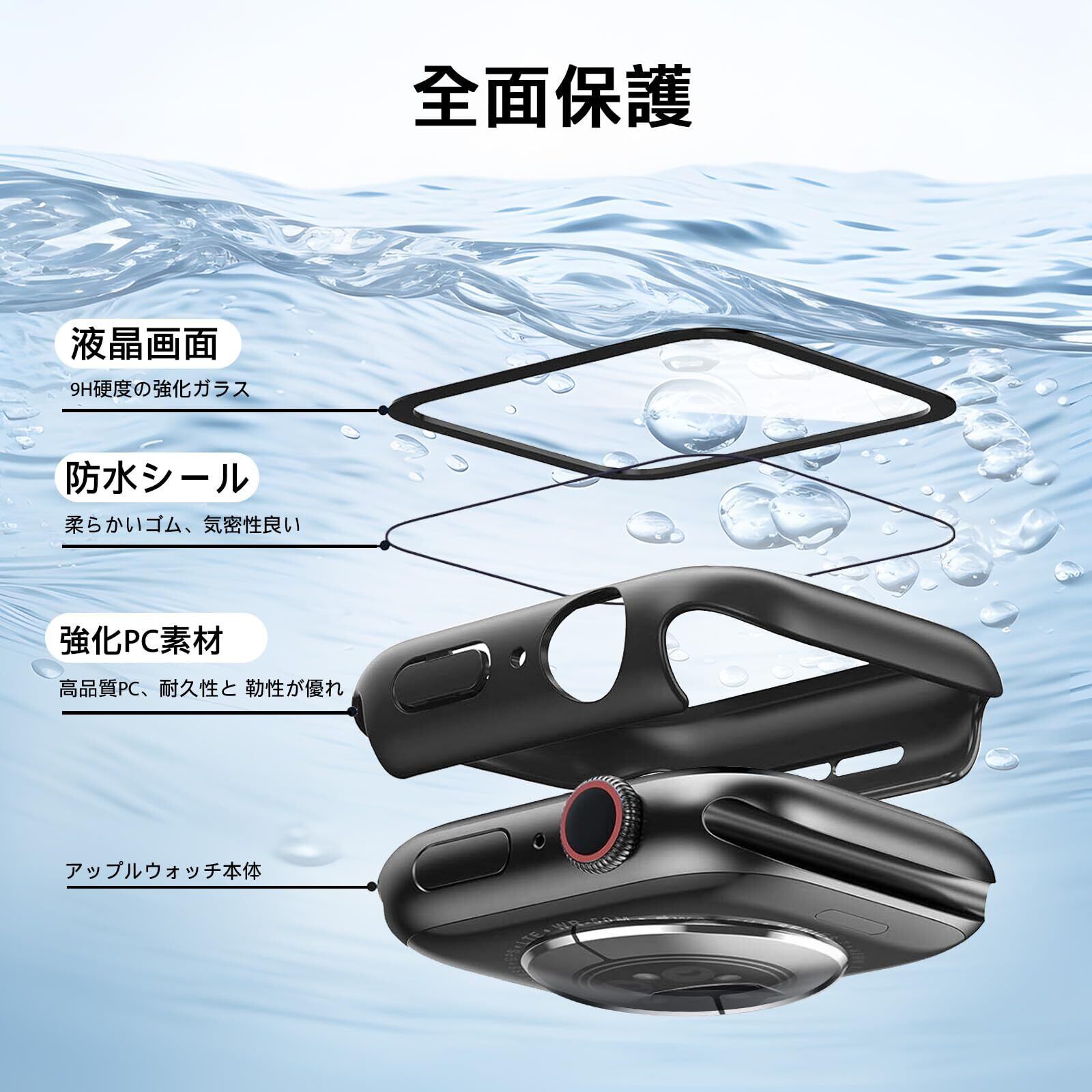 【防水・防塵】シーリングリング内蔵したApple Watchケース、Apple Watchの画面にぴったりとフィットし、水の浸入を防ぎます。ほこりを完全に防ぎ、ケースを取り外して水を拭くすることを繰り返す必要はありません。疎水性撥油性抜群の強化ガラス表面により、カバー面に水が溜まらず、シャワー、手洗い、発汗、運動、雨など、日常の使用に適しています。(ご注意:ダイビングなどの深層水耐性には適しません。)
