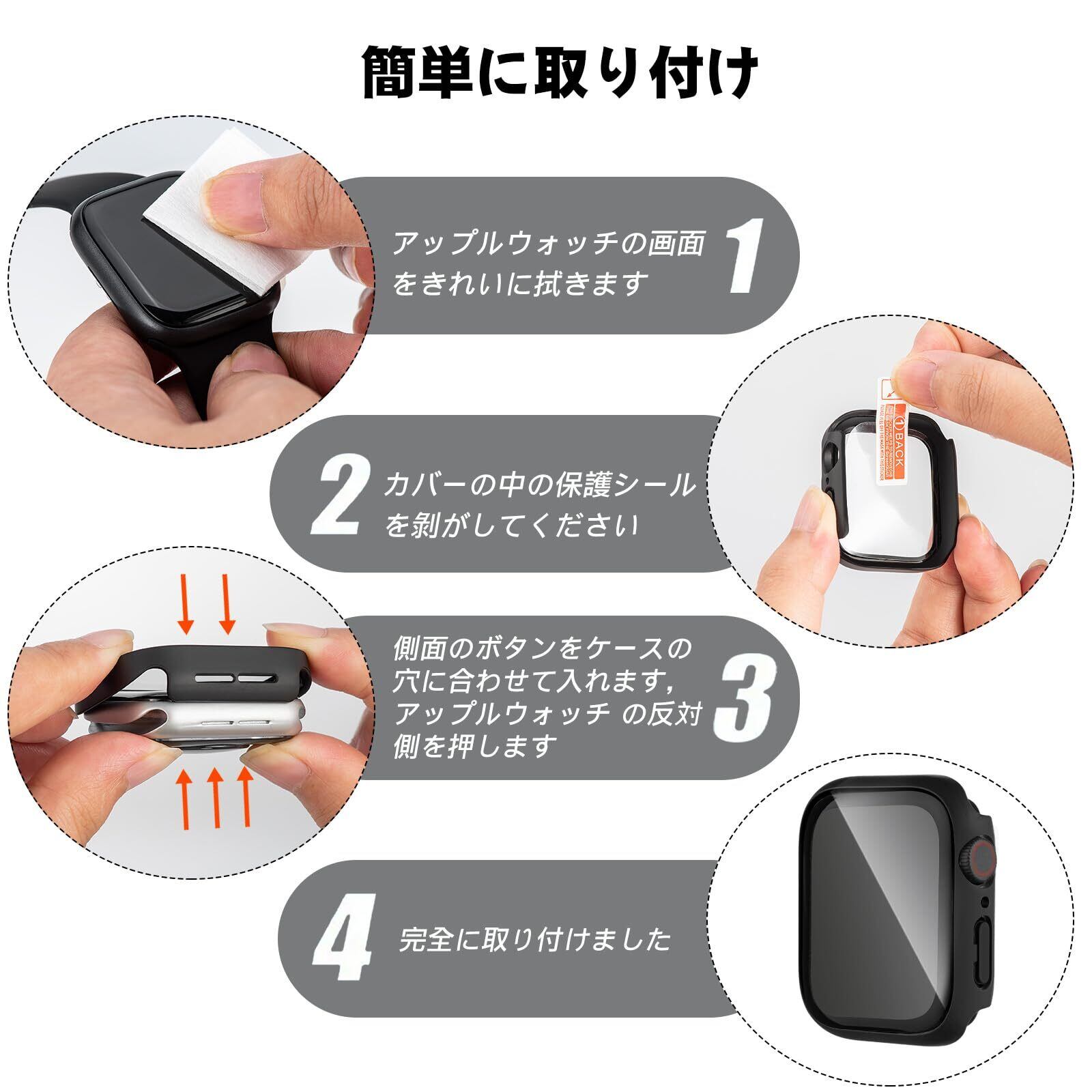 【高タッチ感度、高透過率・佩戴简单】このApple Watch ケースをつけたまま、タッチスクリーンに直接触れ、スピーカーやマイクもすべて簡単にアクセスできます。各ボタンは高いタッチ感度を提供して、スムーズで快適な操作を実現します。高透光率なアップルウォッチ カバーで、iWatch 元の画質と視覚を完全に復元します。 Apple Watchガラスフィルム+保護カバーの融合された革新的な一体型デザイン。取付け道具不要、本体の上から嵌めるだけで楽に装着できます。(取り付け後、タッチが敏感でない状況に遭遇した場合は、ケースをそっと押して空気を排出し、正常に使用できるようにしてください。)