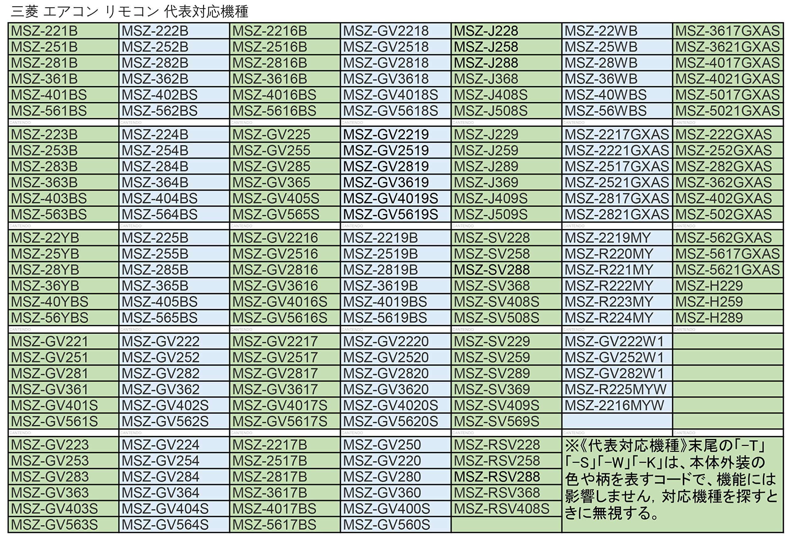 この 霧ヶ峰 エアコン リモコン が適用できる三菱製エアコンの主な機種は、MSZ-GV225 MSZ-GV255 MSZ-GV285 MSZ-GV365 MSZ-GV405S MSZ-GV565S MSZ-GV2217-W MSZ-GV2217-T MSZ-GV2517-W MSZ-GV2517-T MSZ-GV2817-W MSZ-GV2817-T MSZ-GV3617-W MSZ-GV3617-T MSZ-GV4017S-W, その他の機種はこのページ下段の製品説明をご覧ください。