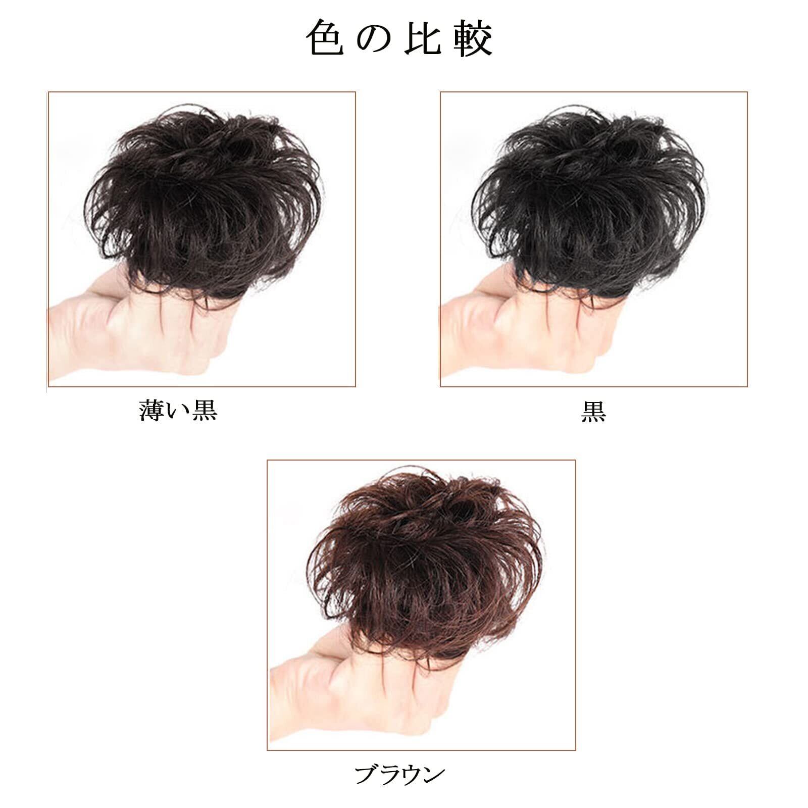 「簡単使用」ゴムのシュシュウィッグです。髪を巻き上げるだけでふわふわとしたお団子になります。