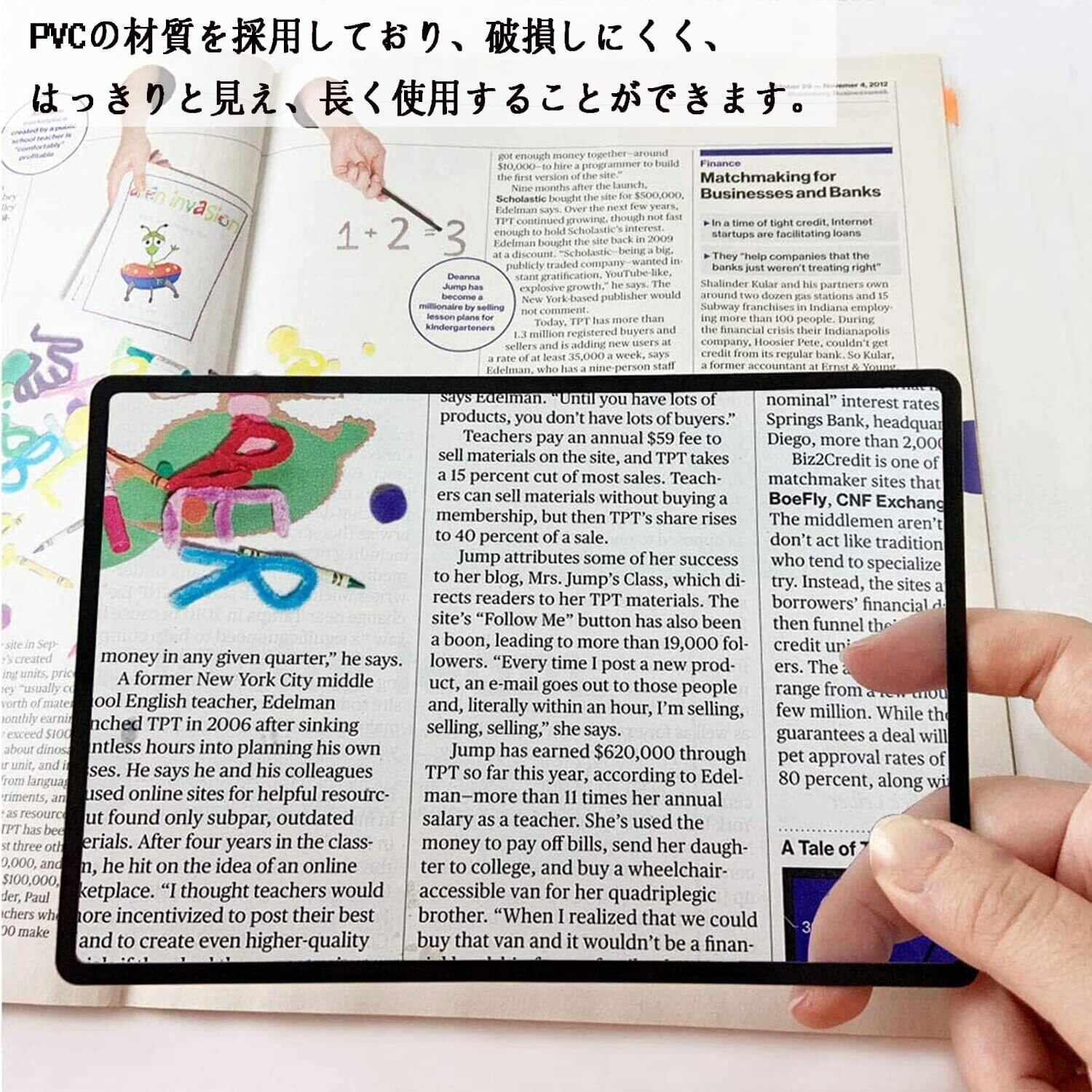 「素材」ページ拡大鏡はPVCの材質を採用しており、破損しにくく、はっきりと見え、長く使用することができます。