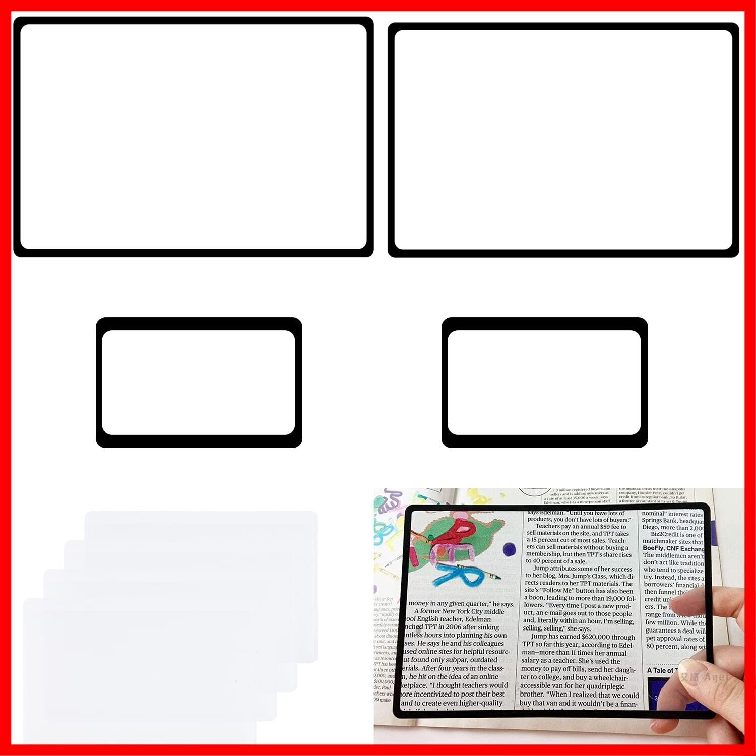 4枚 カード拡大鏡 ページ拡大シート 3倍拡大 虫眼鏡 カードルーペ 超薄型 ページ拡大レンズ 見やすい 軽い 読書ルーペ (8.5×5.5 cmと18×12 cm)